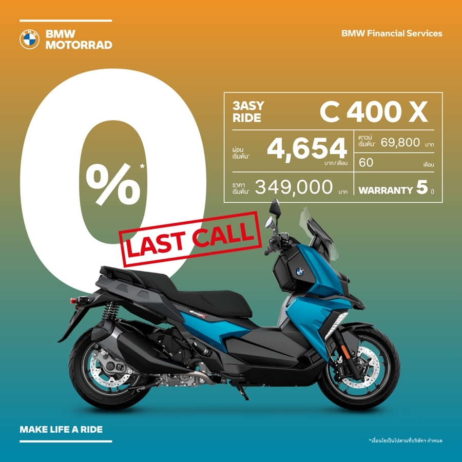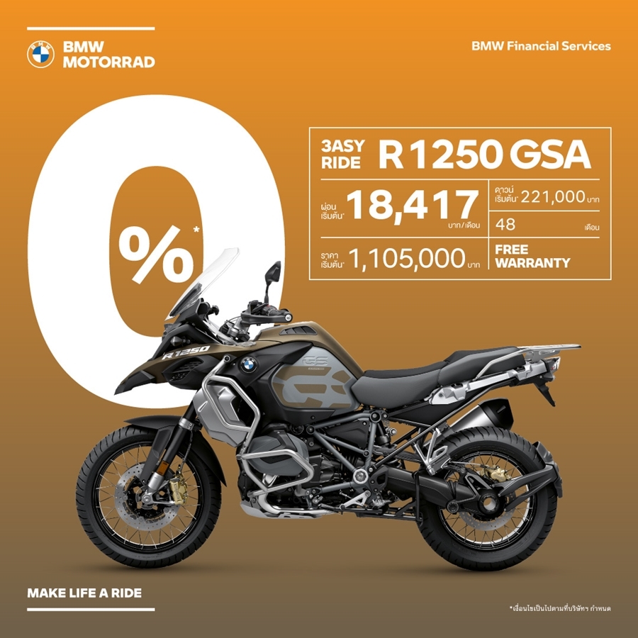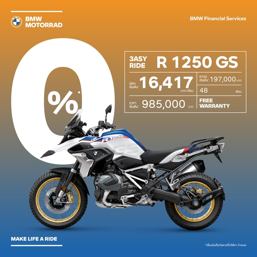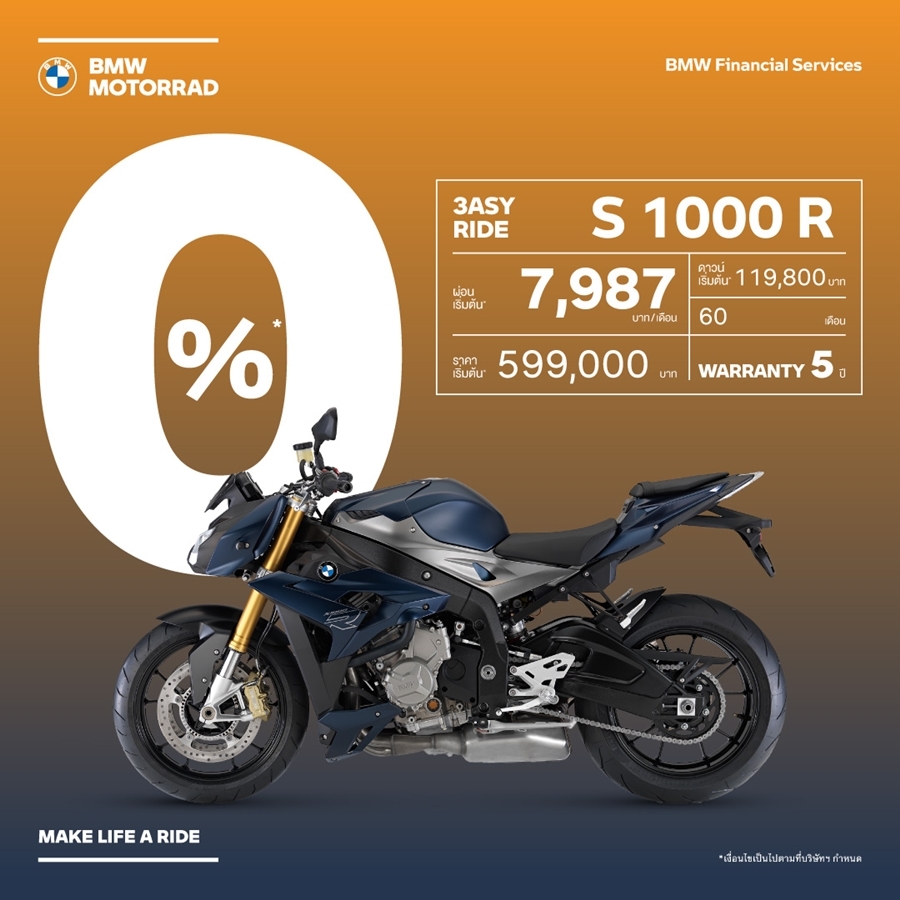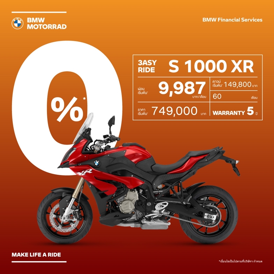 - ข้อเสนอนี้พิเศษสำหรับลูกค้าที่จองรถบีเอ็มดับเบิลยู มอเตอร์ราด พร้อมทำสัญญาทางการเงินที่ร่วมรายการกับ บีเอ็มดับเบิลยู ไฟแนนเชียล เซอร์วิส ประเทศไทย ตั้งแต่วันนี้ – 30 พฤศจิกายน 2564 และรับรถภายใน 30 พฤศจิกายน 2564