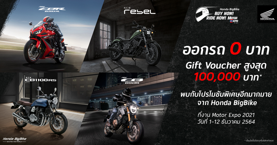 ไบเกอร์ห้ามพลาด! กับโปรโมชั่นเด็ดจาก HONDA ออกรถ Bigbike ภายในงาน Motor Expo 2021 เพียงแค่ 0 บาท! พร้อมรับ Gift Voucher สูงสุด 100,000 บาท พร้อมด้วยโปรโมชั่นพิเศษอีกมากมายจาก Honda Bigbike พบกันได้ที่บูธ Honda ในงาน Motor Expo 2021 วันที่ 1 - 12 ธ.ค. 2564