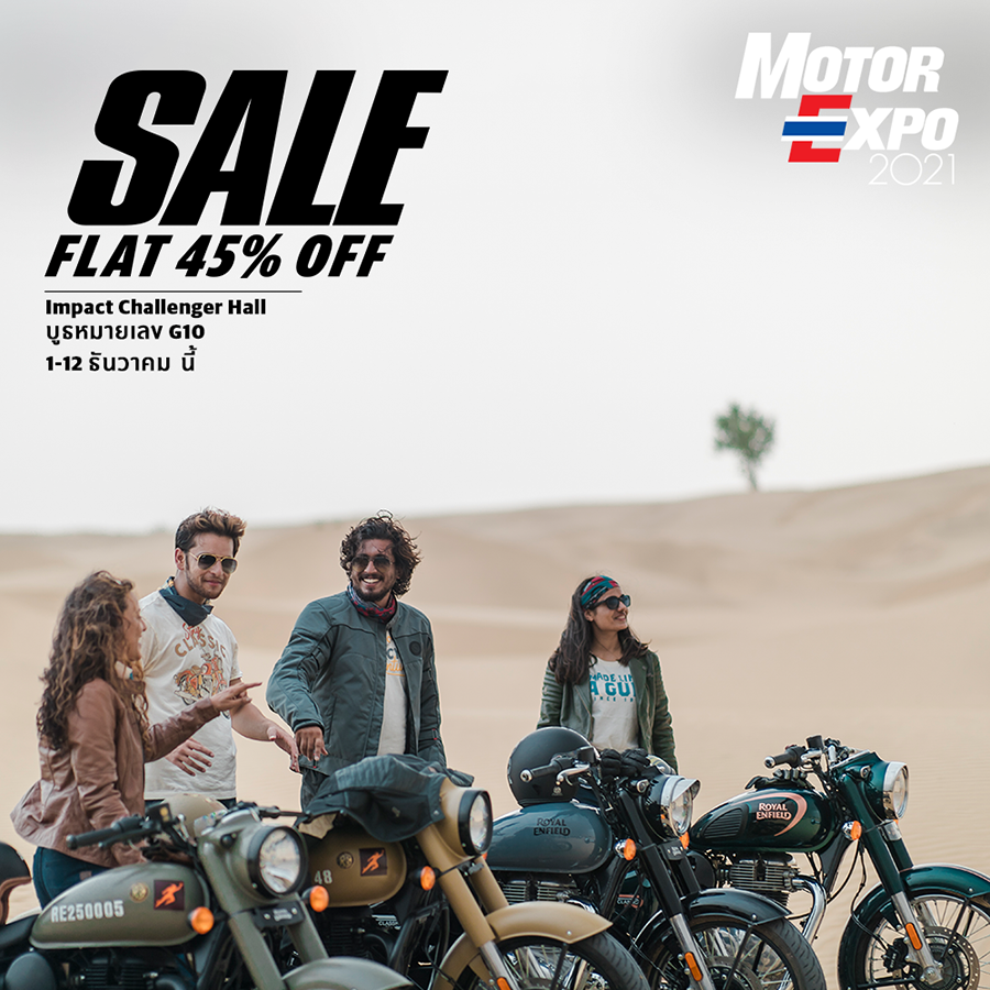 พร้อมข้อเสนอพิเศษ รับส่วนลด 45% เมื่อซื้อเสื้อผ้าเครื่องแต่งกาย พิเศษเฉพาะในงาน Motor Expo 2021 เท่านั้น พบกับ Royal Enfield ได้ที่บูธหมายเลข G10 ตั้งแต่วันที่ 1 - 12 ธันวาคมนี้ ที่ Impact เมืองทองธานี