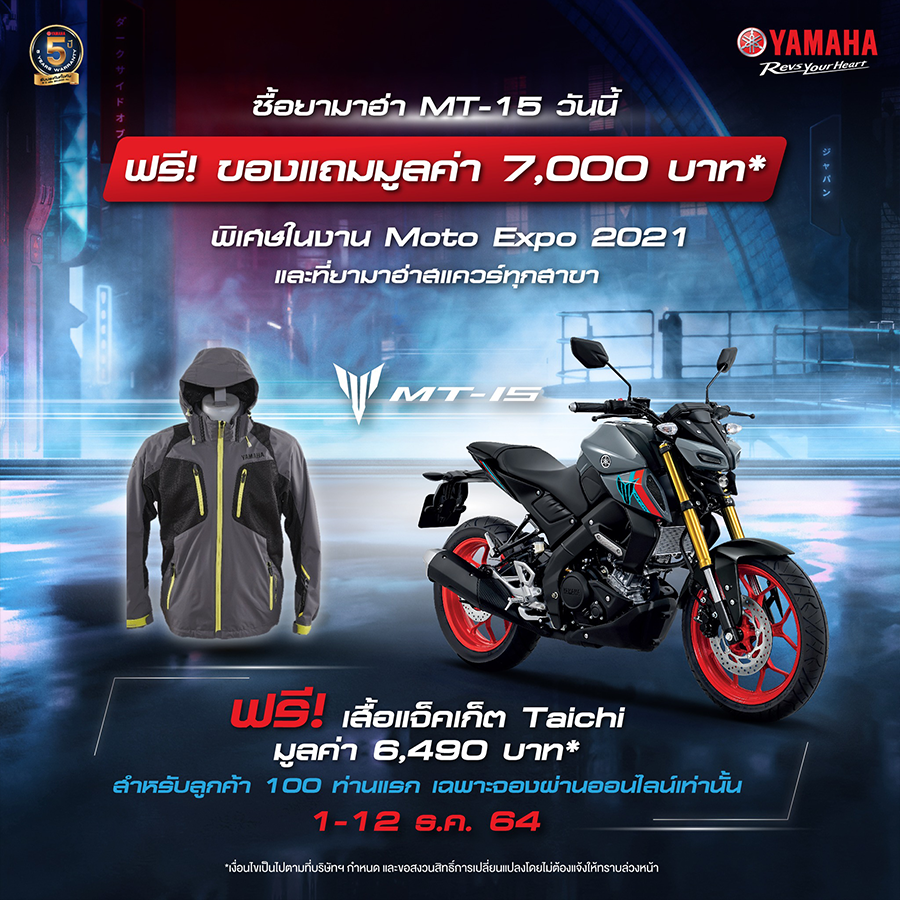 ซื้อ YAMAHA MT-15 ฟรี! ของแถม มูลค่า 7,000 บาท* พิเศษยิ่งขึ้นเฉพาะลูกค้าที่จองออนไลน์ 100 ท่านแรก รับฟรี แจ็คเก็ต Taichi มูลค่า 6,490 บาท*