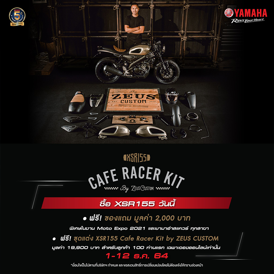 ซื้อ YAMAHA XSR155 ฟรี! ของแถม มูลค่า 2,000 บาท* เฉพาะลูกค้าที่จองออนไลน์ 100 ท่านแรก รับฟรี ชุดแต่ง XSR155 Cafe Racer Kit by Zeus Custom มูลค่า 19,900 บาท*