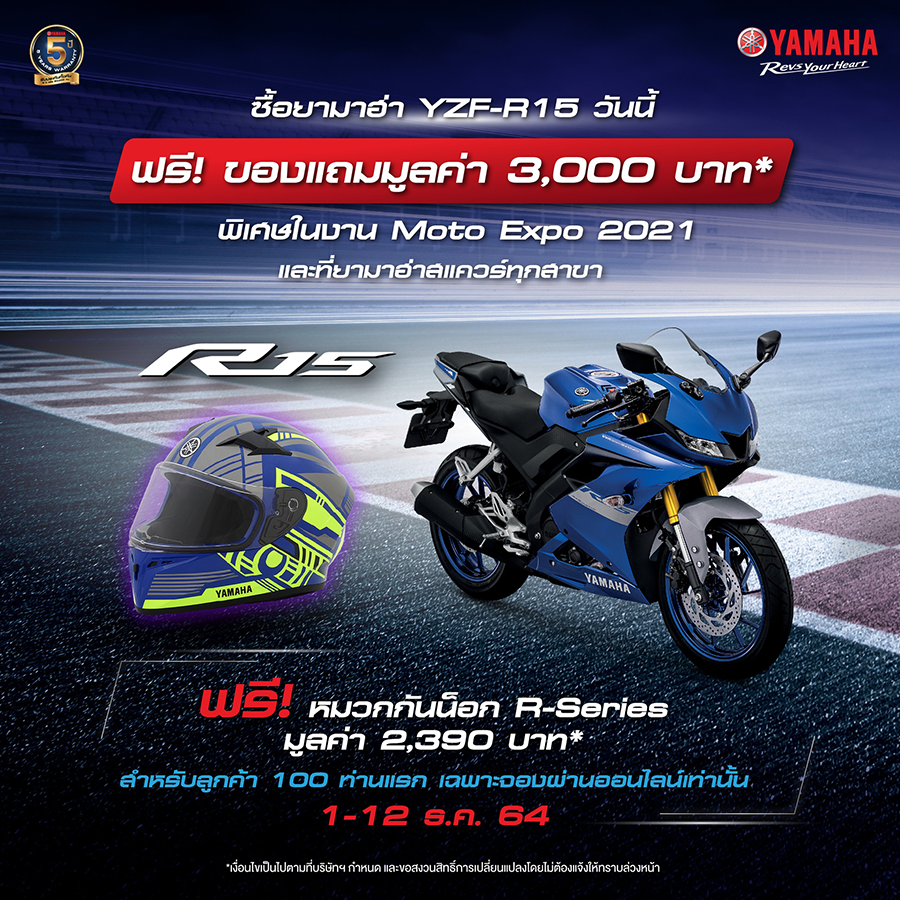 ซื้อ Yamaham YZF-R15 ฟรี! ของแถม มูลค่า 3,000 บาท* พิเศษยิ่งขึ้นเฉพาะลูกค้าที่จองออนไลน์ 100 ท่านแรก รับฟรี หมวกกันน็อก R-Series มูลค่า 2,390 บาท*