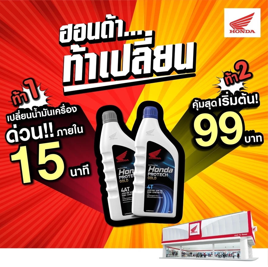 แคมเปญ ฮอนด้าท้าเปลี่ยน มอบบริการเปลี่ยนน้ำมันเครื่องด่วนพิเศษภายใน 15 นาที ด้วยราคาเริ่มต้นเพียง 99 บาท (Honda Protech Gold Semi Synthetic 0.7L) รับประกันความพึงพอใจด้วย 2 คำท้าเพื่อลูกค้าทุกคน