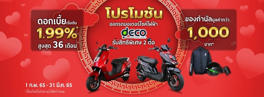 - ขอสงวนสิทธิ์สำหรับลูกค้าที่ออกรถมอเตอร์ไซค์ไฟฟ้า Deco EV Bike ทุกรุ่น และสมัครสินเชื่อ กรุงศรี มอเตอร์ไซค์ ผ่านทุกช่องทาง ของกรุงศรี ออโต้ ระหว่างวันที่ 1 กุมภาพันธ์ 2565 – 31 มีนาคม 2565 พร้อมทั้งได้รับอนุมัติเป็นเลขที่สัญญาและรับรถภายในวันที่ 30 เมษายน 2565 เท่านั้น