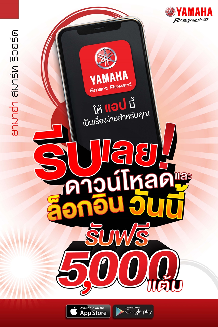 พิเศษ สำหรับสมาชิกใหม่ ดาว์นโหลดและล็อคอิน วันนี้ รับฟรีทันที 5,000 แต้ม สามารถดาวน์โหลดและล็อคอินได้แล้ววันนี้!! YAMAHA SMART REWARD แอปพลิเคชัน บน iOS และ Android