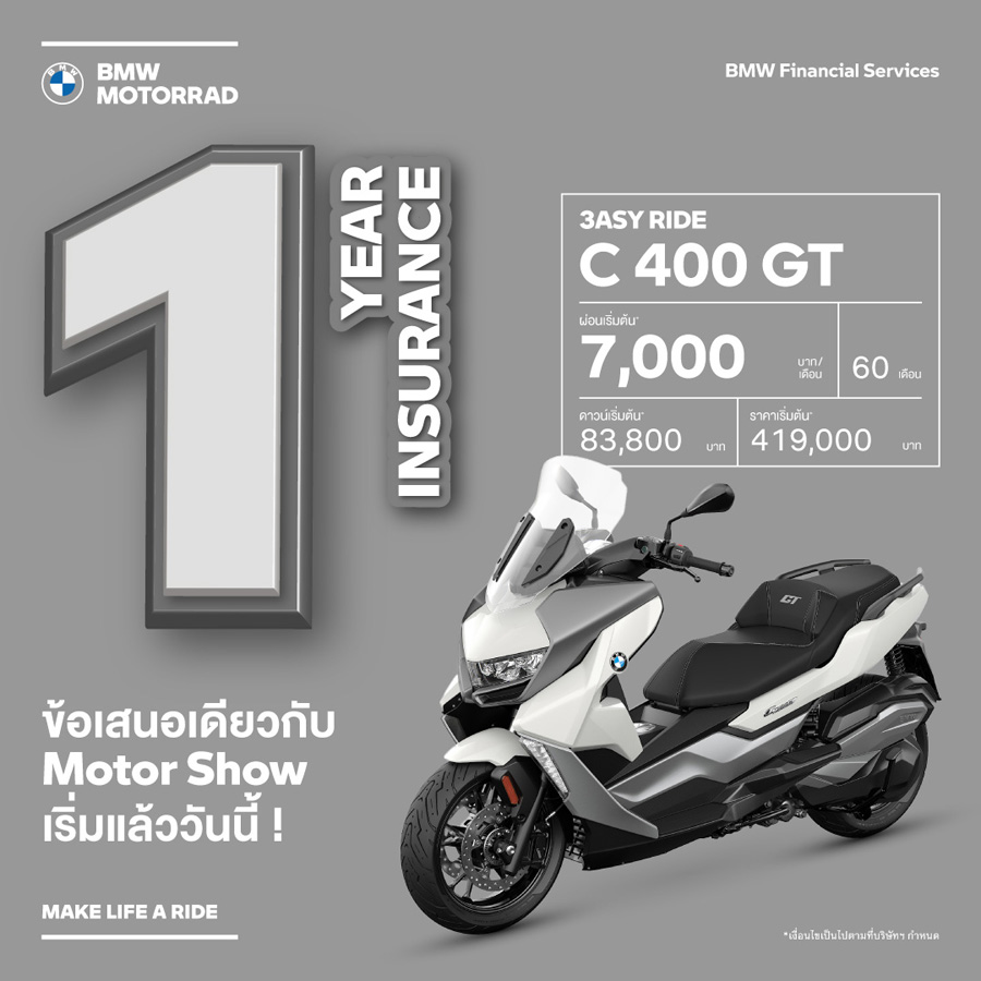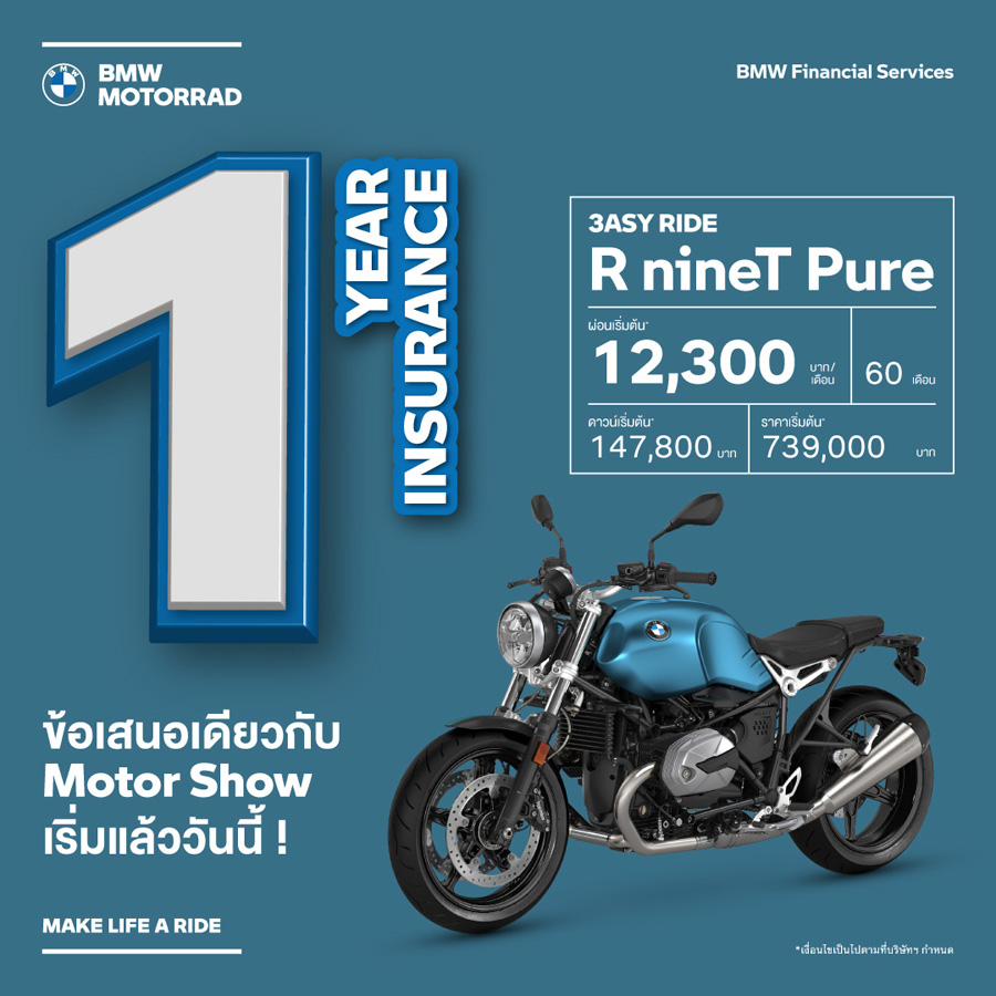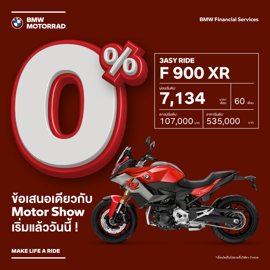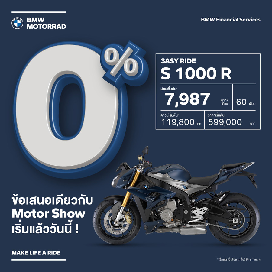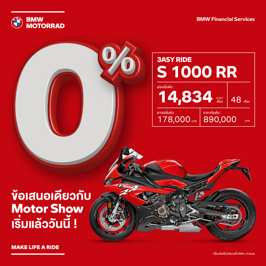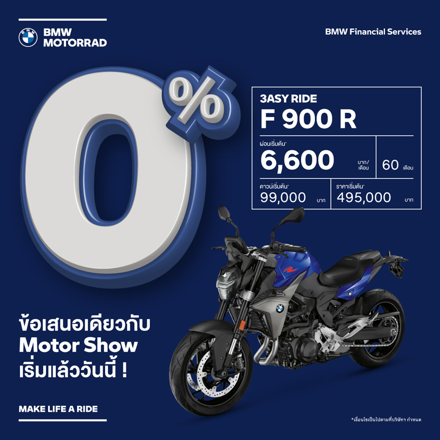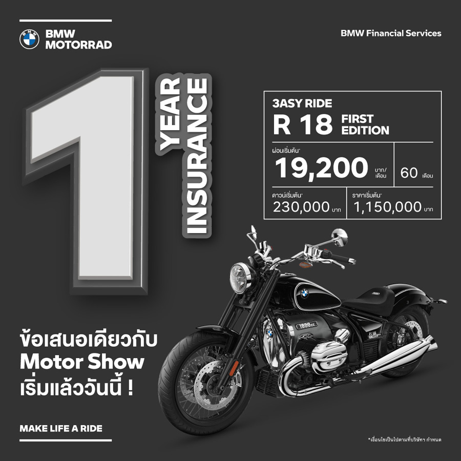 - ข้อเสนอนี้พิเศษสำหรับลูกค้าที่จองรถบีเอ็มดับเบิลยู มอเตอร์ราด พร้อมทำสัญญาทางการเงินที่ร่วมรายการกับ บีเอ็มดับเบิลยู ไฟแนนเชียล เซอร์วิส ประเทศไทย ตั้งแต่วันนี้ – 31 มีนาคม 2565 และรับรถภายในวันที่ 31 มีนาคม 2565