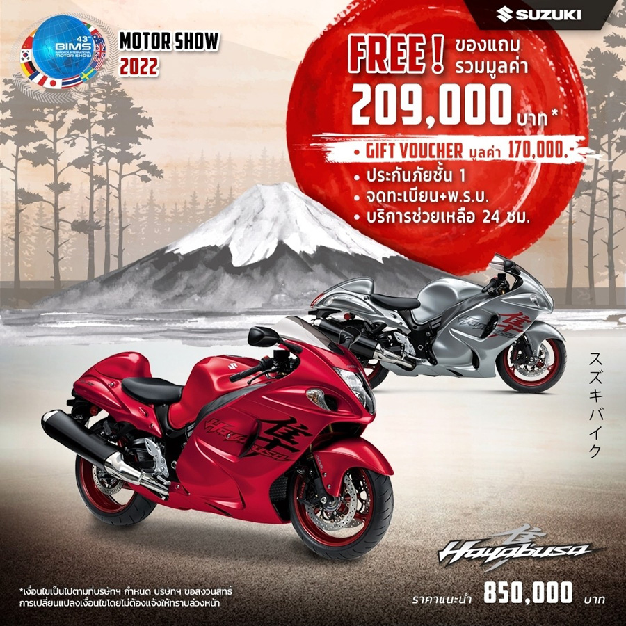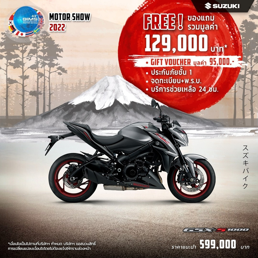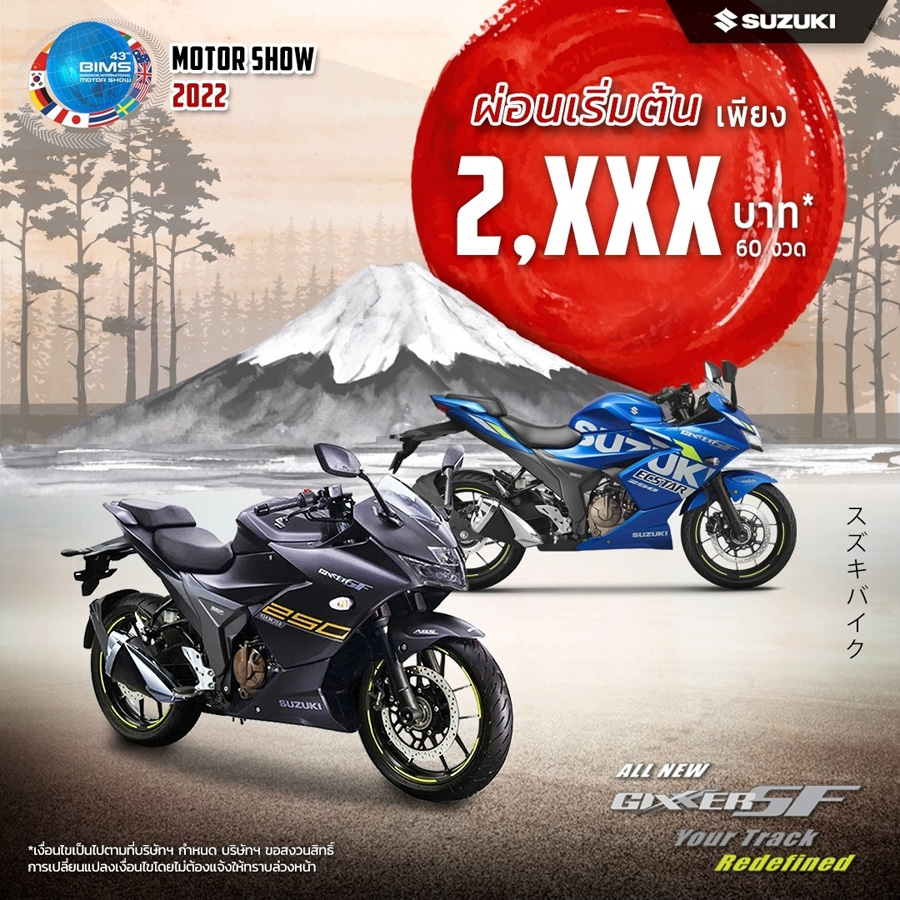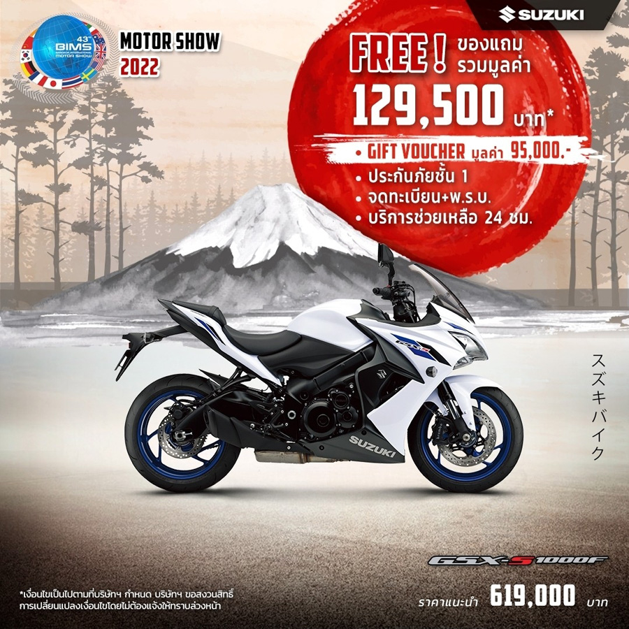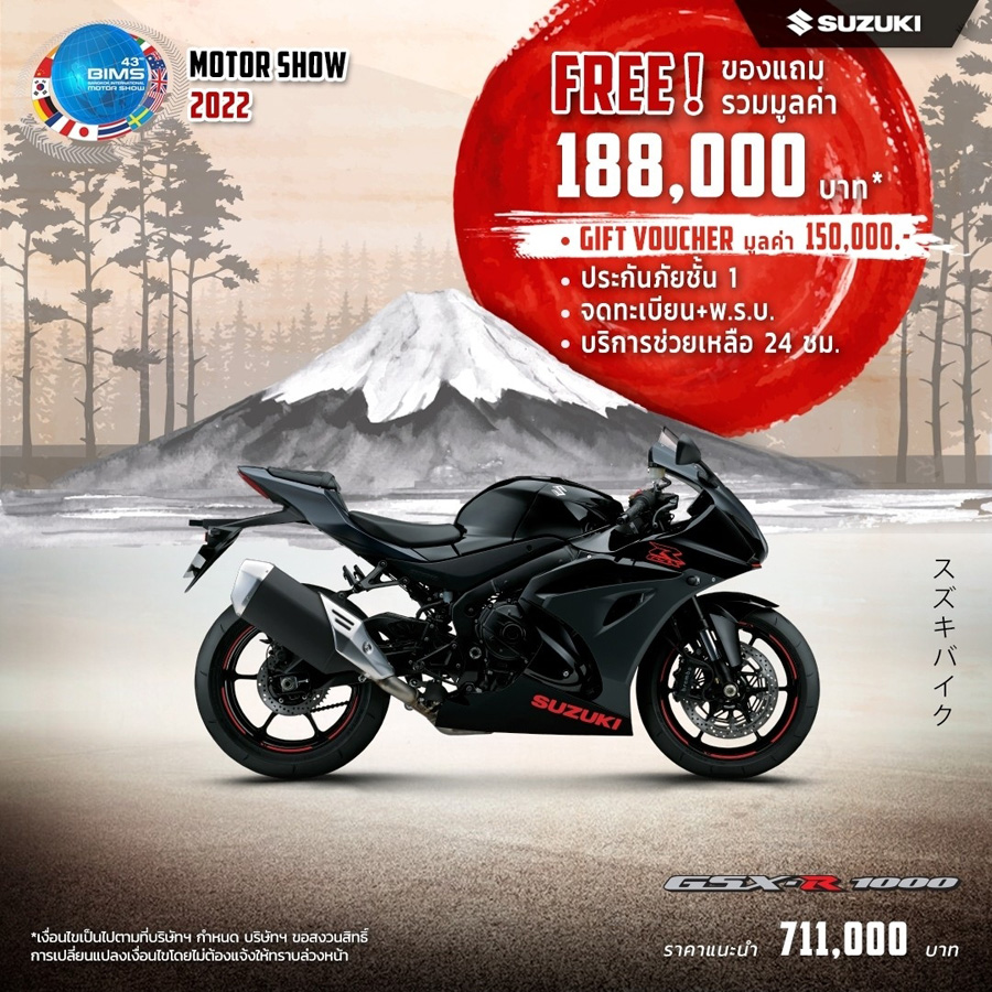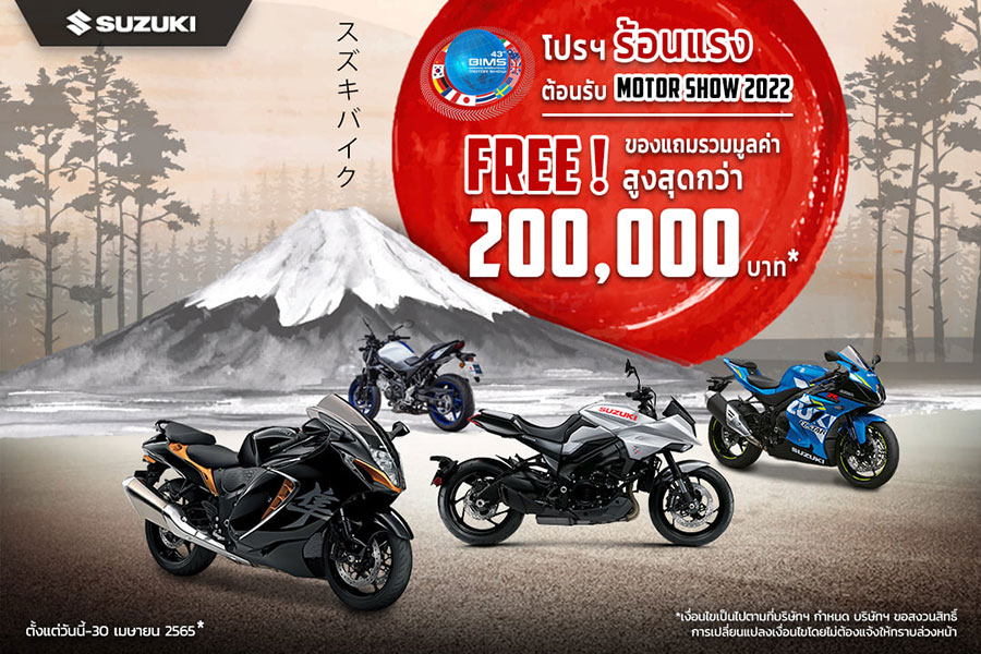 SUZUKI จัดโปรโมชั่นท้าลมร้อน! ต้อนรับ Motor Show 2022 เอาใจไบค์เกอร์แบบเต็ม ๆ กับรถมอเตอร์ไซค์ทุกแนวทุกสไตล์ ตั้งแต่วันนี้ - 30 เม.ย. 2565 โดยมาพร้อมกับโปรโมชั่นไฮไลท์โปรโมชั่นเด่น ๆ ได้แก่