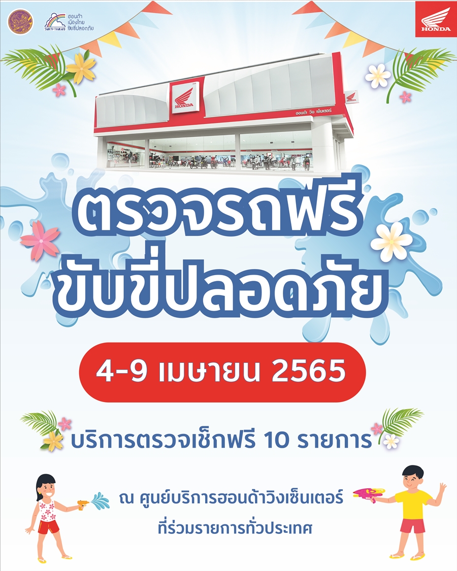 ฮอนด้า มอบบริการพิเศษภายใต้แคมเปญ ตรวจรถฟรี ขับขี่ปลอดภัย เพื่อสร้างความอุ่นใจให้กับผู้ใช้รถจักรยานยนต์ฮอนด้า ก่อนเดินทางในช่วงเทศกาลสงกรานต์ ด้วยบริการตรวจเช็กรถฟรี 10 รายการ พร้อมเปลี่ยนถ่ายน้ำมันเครื่องในราคาพิเศษเพียง 39 บาทเท่านั้น และมอบส่วนลดพิเศษสำหรับอะไหล่ประเภทยางใน ผ้าเบรก หัวเทียน ไส้กรองอากาศ และหลอดไฟ ลดสูงสุดถึง 30% (เฉพาะรุ่นที่กำหนด) เพื่อให้ลูกค้าได้ใช้รถอย่างปลอดภัย
