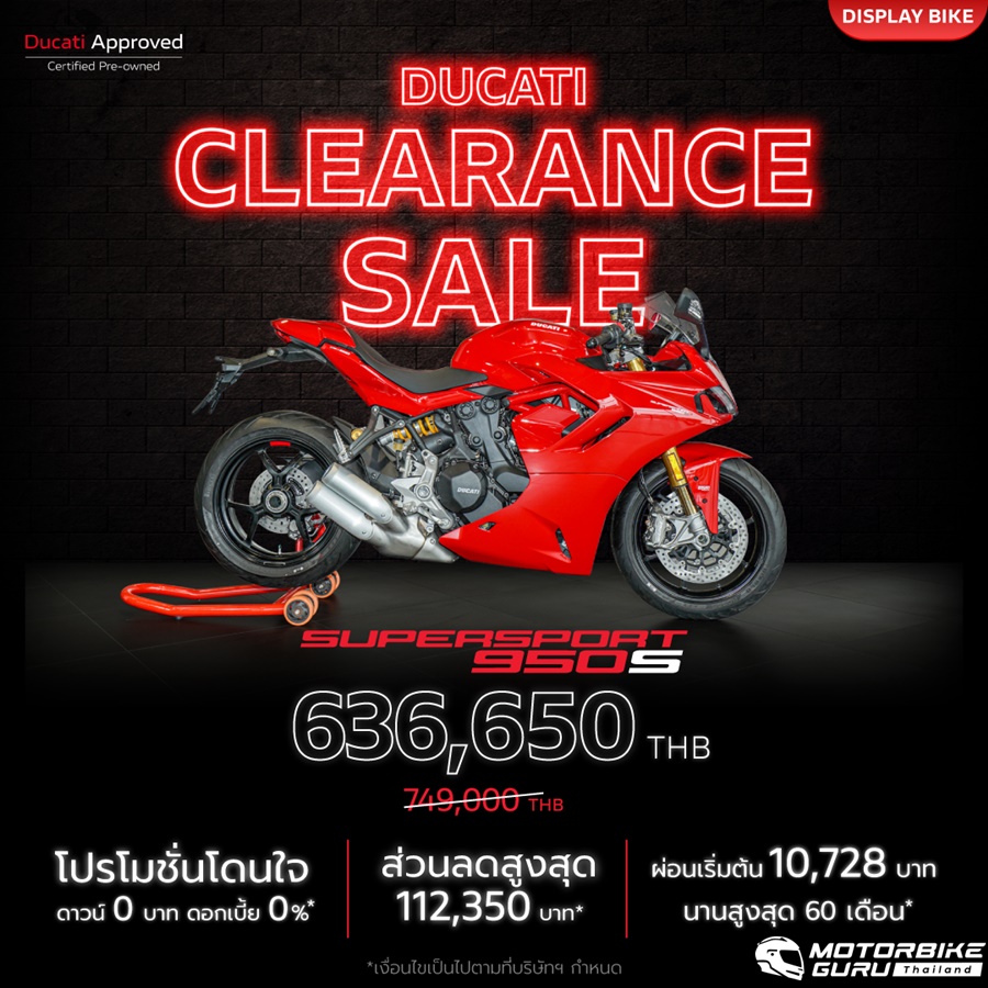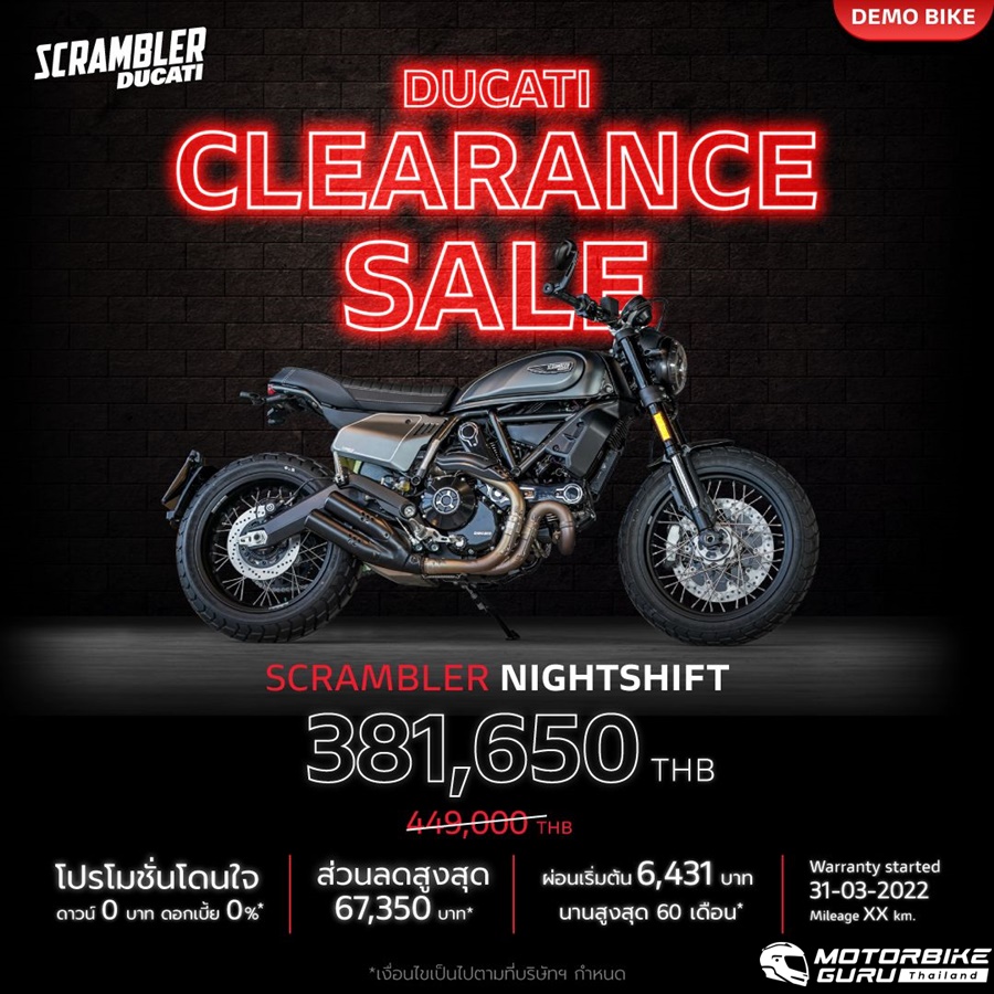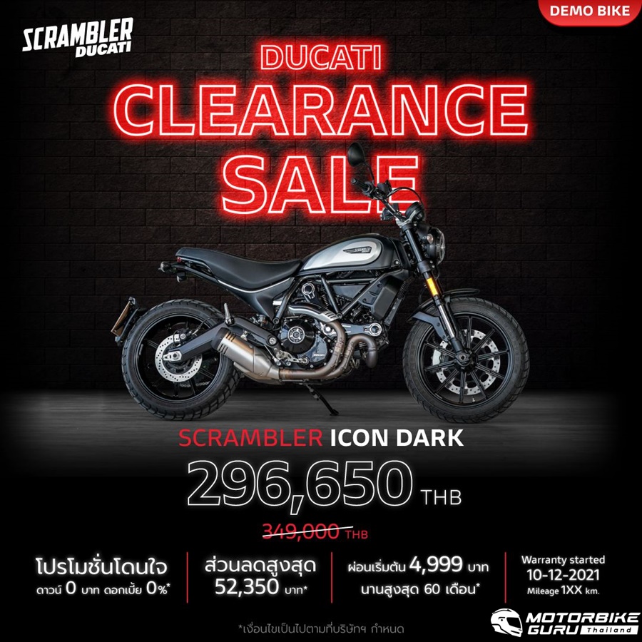 “สำหรับ Ducati เป็นครั้งแรกกับงาน Clearance Sale เราขนขบวนรถทดลองขับ และรถ Display พร้อมข้อเสนอแบบจัดเต็ม บางคันมีสภาพเหมือนใหม่ ไมล์น้อยเพียงร้อยกว่ากิโลเมตร จัดมาให้เหล่าไบค์เกอร์ในราคาพิเศษ ส่วนลดสูงสุดกว่า 379,000 บาท (Multistrada V4S) พร้อมแคมเปญเดียวกับรถใหม่ ดาวน์ 0 บาท และดอกเบี้ย 0% ทุกคัน ราคารถในงานเริ่มต้นเพียง 296,650 บาท เลือกผ่อนสบายเพียง 4,999 บาท/เดือน ก็เป็นเจ้าของ Scrambler Icon Dark ได้”