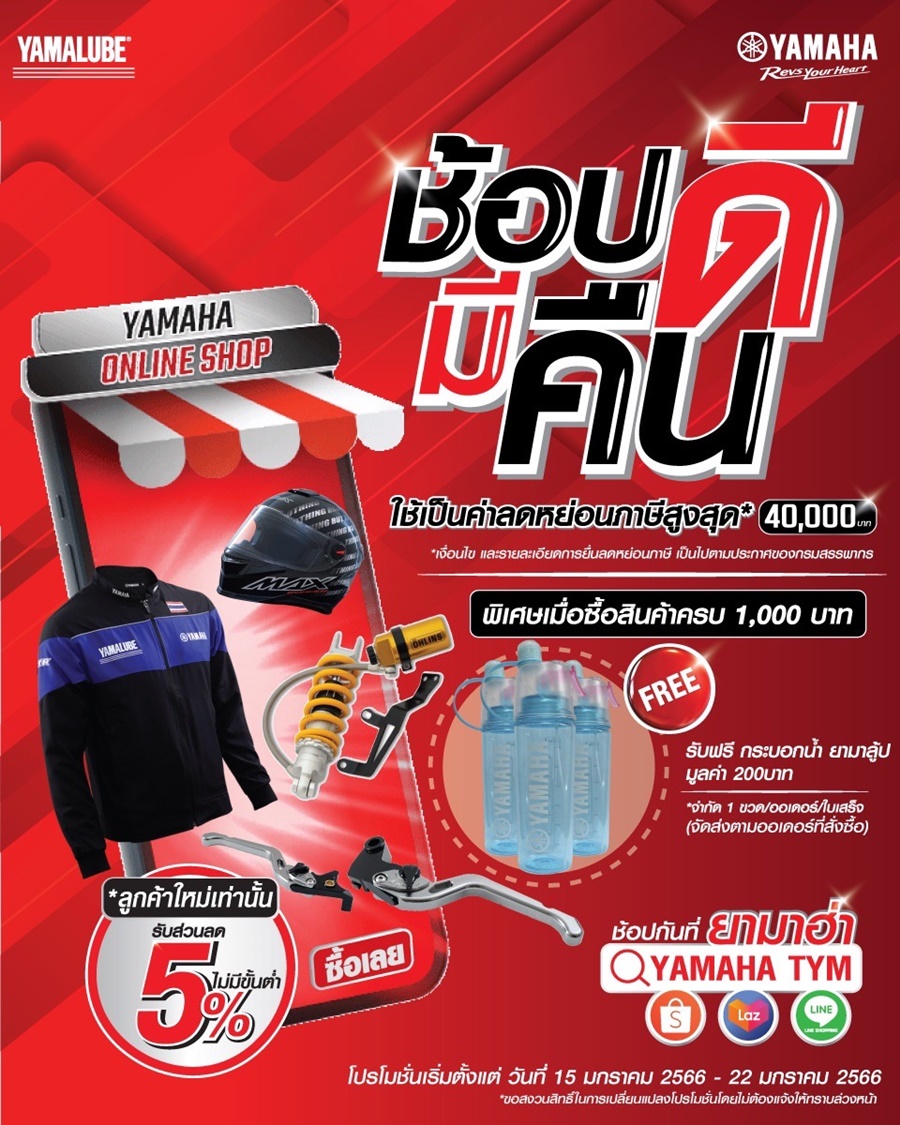 ยามาฮ่าตอบรับมาตรการลดหย่อนภาษีประจำปี ยิ่งช้อปยิ่งคุ้มกับสินค้าราคาพิเศษจากยามาฮ่า เมื่อซื้อสินค้า เครื่องแต่งกาย อะไหล่ตกแต่ง และผลิตภัณฑ์ยามาลู้ป ผ่านแพลตฟอร์มออนไลน์ Shopee Lazada และ Line Shopping ระหว่างวันที่ 15 – 22 มกราคม 2566 นี้เท่านั้น พร้อมรับสิทธิพิเศษสำหรับลูกค้าใหม่รับส่วนลด 5% ไม่จำกัดขั้นต่ำในการซื้อ พร้อมรับกระบอกน้ำยามาลู้ป สุดคูล มูลค่า 200 บาท เมื่อซื้อสินค้าครบ 1,000 บาท *จำกัด 1 ขวด/ออเดอร์/ใบเสร็จ พร้อมกันนี้สามารถใช้สิทธิลดหย่อนภาษีประจำปีสูงสุด 40,000 บาท