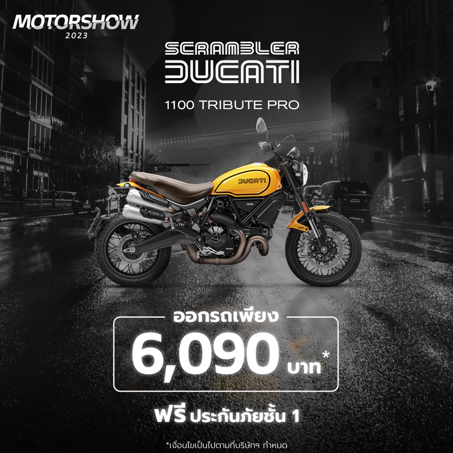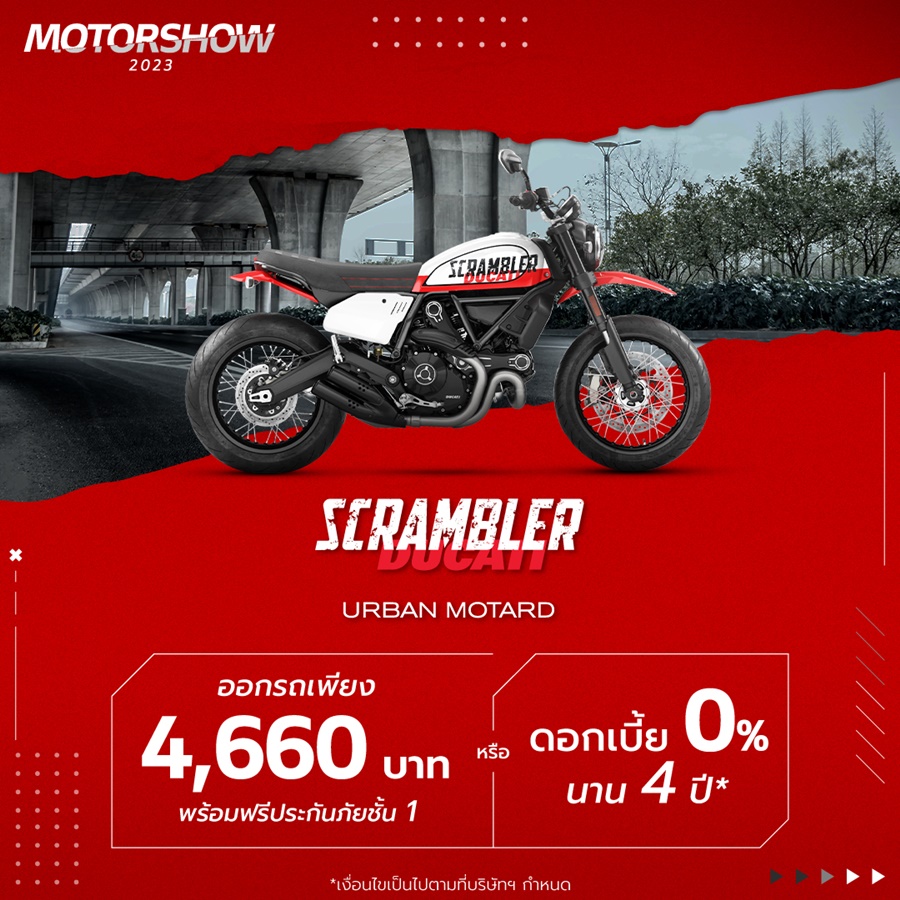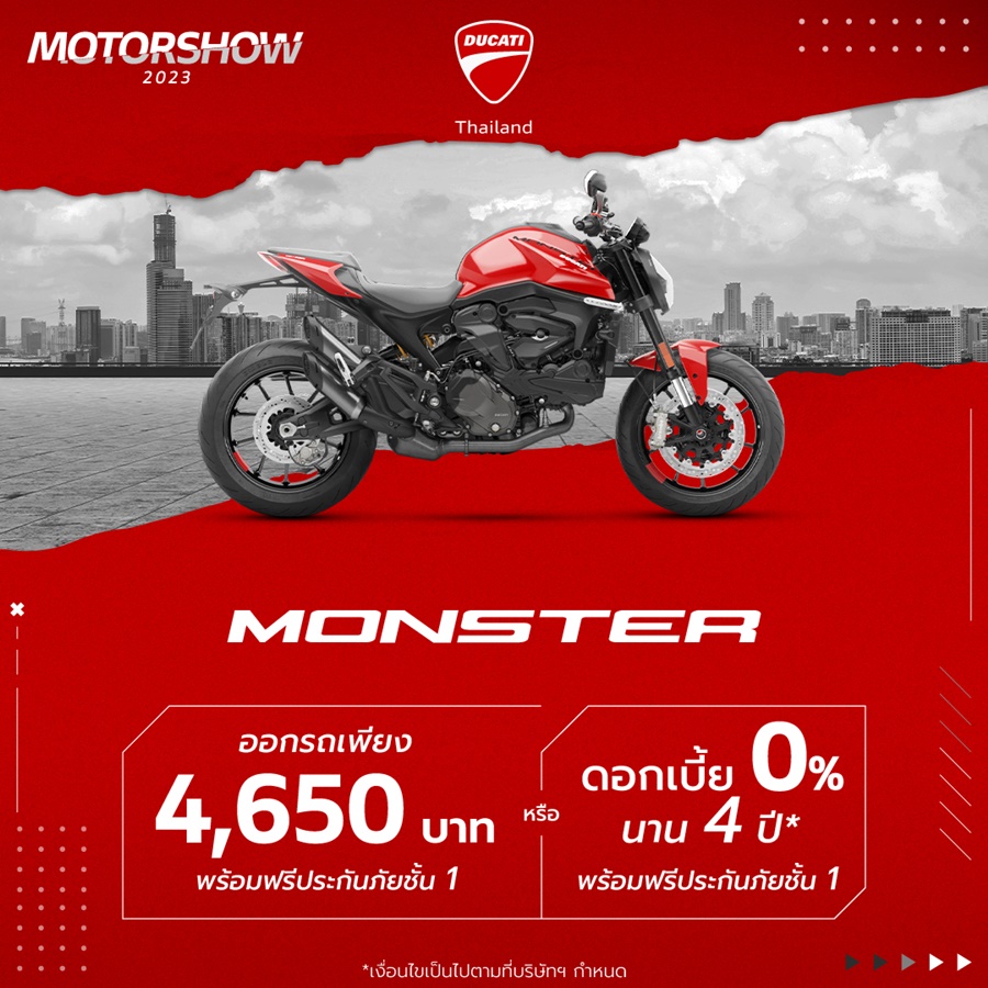 บริษัท โมโตเร อิตาเลียโน จำกัด ผู้นำเข้าและจัดจำหน่ายรถจักรยานยนต์ดูคาติอย่างเป็นทางการในประเทศไทย ประกาศว่า “แคมเปญ Ducati Motor Show 2023 ที่ลูกค้ารอคอย ได้เริ่มขึ้นแล้ว กับงาน Ducati Motor Show It’s all start now ในปีนี้ จัดใหญ่จัดหนัก แบบไม่ต้องถามวิ!! เพื่อให้ลูกค้าเป็นเจ้าของรถจักรยานยนต์ดูคาติ ได้ง่ายๆ ก่อนใคร โดยเฉพาะ 3 รุ่นฮอต ที่กำลังได้รับความนิยมเป็นอย่างมากในกลุ่มไบค์เกอร์ เริ่มจาก Scrambler Nightshift ที่เหลือเพียง 14 คันเท่านั้นในไทย มาพร้อมแคมเปญออกรถสุดง่าย จ่ายเริ่มต้นเพียง 4,490 บาท พร้อมฟรีประกันภัยชั้น 1 และรุ่น Monster 937 ที่ชวนให้ขี่ทันที กับแคมเปญออกรถเริ่มต้นเพียง 4,530 บาท พร้อมฟรีประกันภัยชั้น 1 ยิ่งไปกว่านั้น ในรุ่นใหญ่สายทัวร์ริ่งกับ Multistrada V4 ยังจัดให้แบบไม่เกรงใจใคร รู้แล้วต้องรีบมาจับจองเป็นเจ้าของทันที กับชุดขับขี่และชุดแต่ง มูลค่ากว่า 180,000 บาท (Enduro/Touring Set) ฟรี สำหรับลูกค้าที่จองและรับรถ ตั้งแต่วันนี้ ถึง 30 เมษายนนี้ เท่านั้น”
