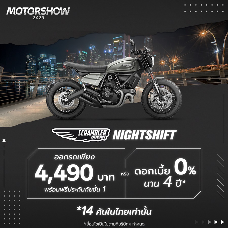 นายดอม เหตระกูล กรรมการผู้จัดการ บริษัท โมโตเร อิตาเลียโน กล่าวว่า “งาน Ducati Motor Show 2023 ปีนี้ เราจัดใหญ่ จัดหนักให้ลูกค้าได้คุ้มค่าสุดๆ และเป็นเจ้าของรถดูคาติ ได้ง่ายไม่ยุ่งยาก โดยเฉพาะในรุ่น Ducati Scrambler Nightshift ที่ให้ลูกค้าจ่ายเริ่มต้นเพียง 4,490 บาท ก็สามารถรับรถไปขี่ได้ทันที พร้อมรับฟรีประกันภัยชั้น 1 หรือ จะเลือกผ่อนสบายเพียง เดือนละ 7,484 บาท นาน 4 ปี หรือ เลือกรับ Voucher 69,000 บาท มั่นใจว่าจากข้อเสนอสุดพิเศษ และด้วยความเป็นบิ๊กไบค์ในสไตล์ Café Racer กับความคลาสสิกที่มีจำนวนจำกัด เหลือเพียง 14 คันเท่านั้น กับ Ducati Scrambler Nightshift จะได้รับความสนใจอย่างล้นหลามและน่าจะถูกจองหมดตั้งแต่สัปดาห์แรก”