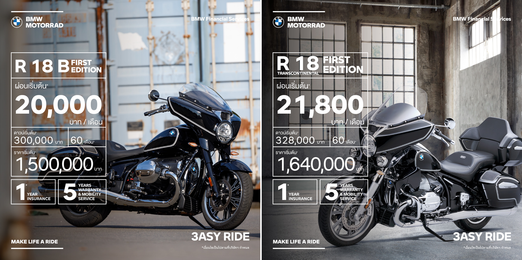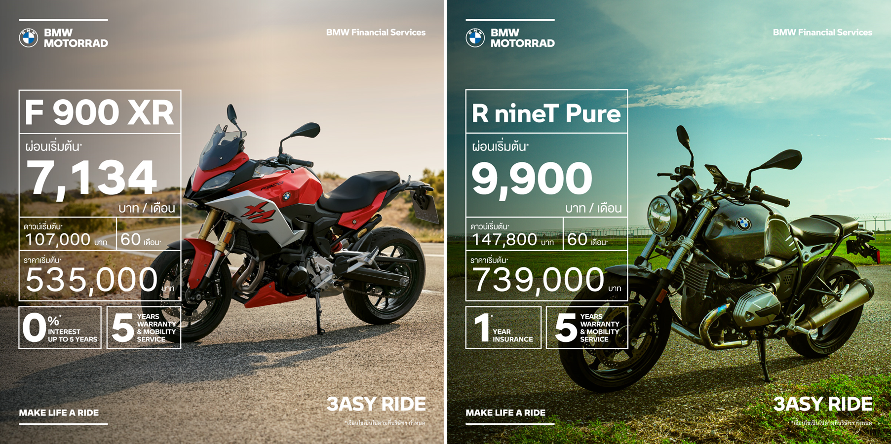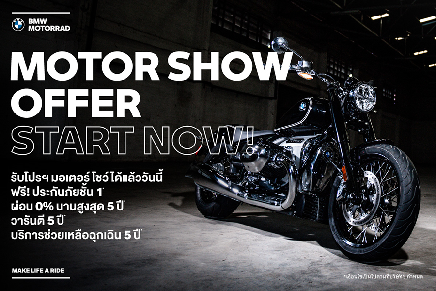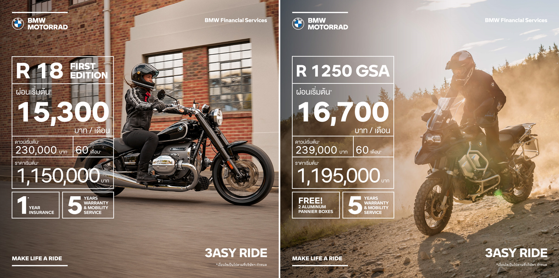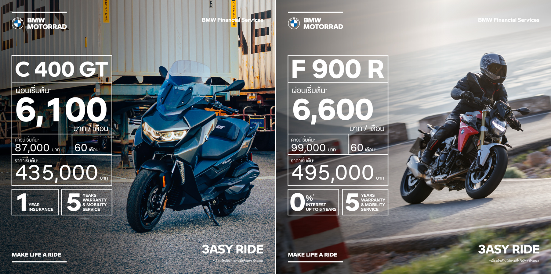 - ข้อเสนอนี้พิเศษสำหรับลูกค้าที่จองรถบีเอ็มดับเบิลยู มอเตอร์ราด พร้อมทำสัญญาทางการเงินที่ร่วมรายการกับ บีเอ็มดับเบิลยู ไฟแนนเชียล เซอร์วิส ประเทศไทย ตั้งแต่วันนี้ – 31 มีนาคม 2566 และรับรถภายในวันที่ 31 มีนาคม 2566