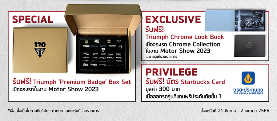 Exclusive : รับฟรี! Triumph Chrome Look Book เมื่อจอง Chrome Collection รุ่นที่ร่วมรายการ 10 คันแรก และออกรถภายในวันที่ 30 เมษายน 2566 เฉพาะในงาน Motor Show 2023 ยกเว้นรุ่น Speed Twin 900 Chrome Edition, Scrambler 900 Chrome Edition และ Bonneville T100 Chrome Edition