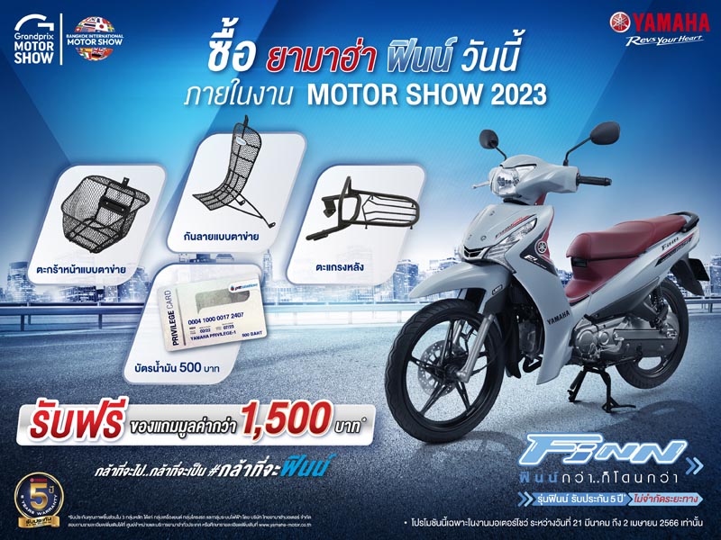 ยามาฮ่า จัดโปรโมชั่นสุดพิเศษในงาน Motor Show 2023 สำหรับรถจักรยานยนต์ขนาด 115 – 155 ซีซี รับ Gift Voucher สูงสุด 15,000 บาท และรถจักรยานยนต์ขนาด 400 – 1,000 ซีซี รับ Gift Voucher สูงสุด 40,500 พร้อมประกันภัยชั้น 1 พิเศษสุดเมื่อซื้ออุปกรณ์ตกแต่งและยามาลู้ปครบ 1,000 บาท รับฟรี! ทันที กระเป๋าเป้ มูลค่า 200 บาท ซื้ออุปกรณ์ตกแต่งและยามาลู้ปครบ 2,000 บาท รับฟรี! ทันที กระเป๋ากันน้ำ มูลค่า 500 บาท จำกัด 1 ใบ / 1 ออเดอร์ / 1 ใบเสร็จ โปรโมชั่นนี้เฉพาะในงานมอเตอร์โชว์ ระหว่างวันที่ 22 มีนาคม ถึง 2 เมษายน 2566 เท่านั้น