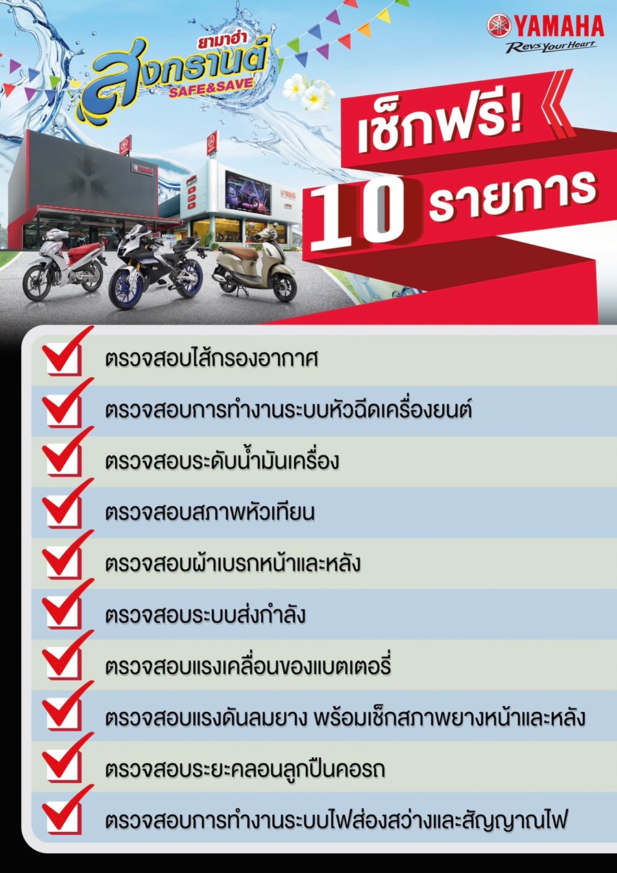 บริษัท ไทยยามาฮ่ามอเตอร์ จำกัด ผู้ผลิตและจำหน่ายรถจักรยานยนต์ยามาฮ่าจัดแคมเปญ Songkran Safe & Save 2566 ต้อนรับวันสงกรานต์ เพื่อให้สอดคล้องกับมาตราการความปลอดภัยบนท้องถนนร่วมกับกรมการขนส่งทางบก โดยจัดแคมเปญ ตรวจรถก่อนใช้เดินทางปลอดภัย สำหรับลูกกค้ารถจักรยานยนต์ยามาฮ่าทุกรุ่นที่ขนาดเครื่องยนต์ไม่เกิน 500 ซีซี ระหว่างวันที่ 1 – 12 เมษายน 2566