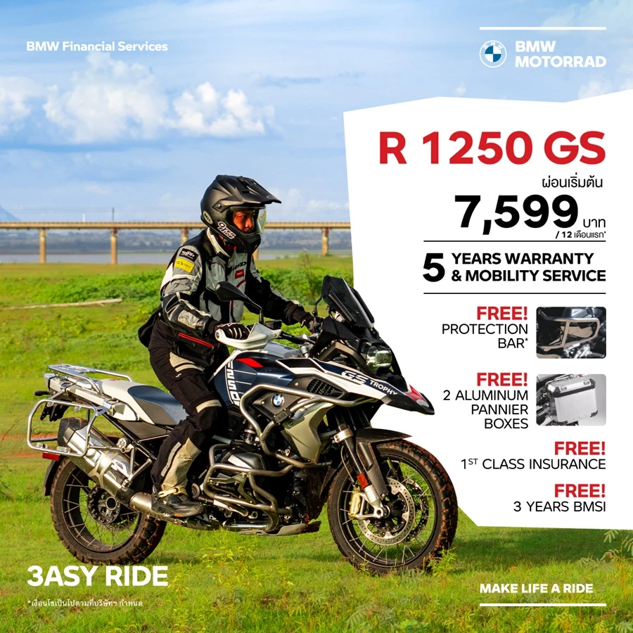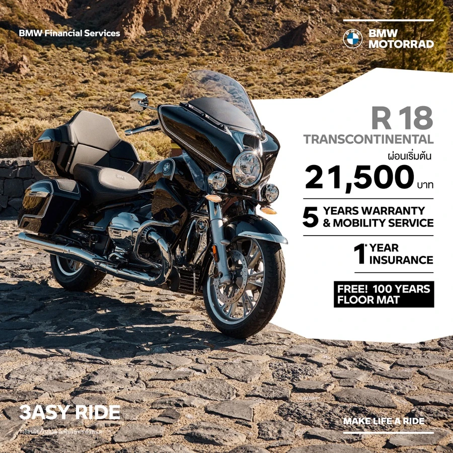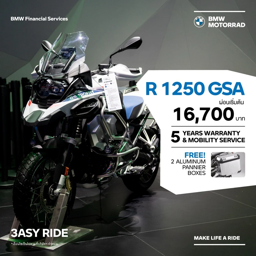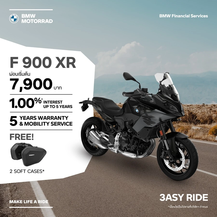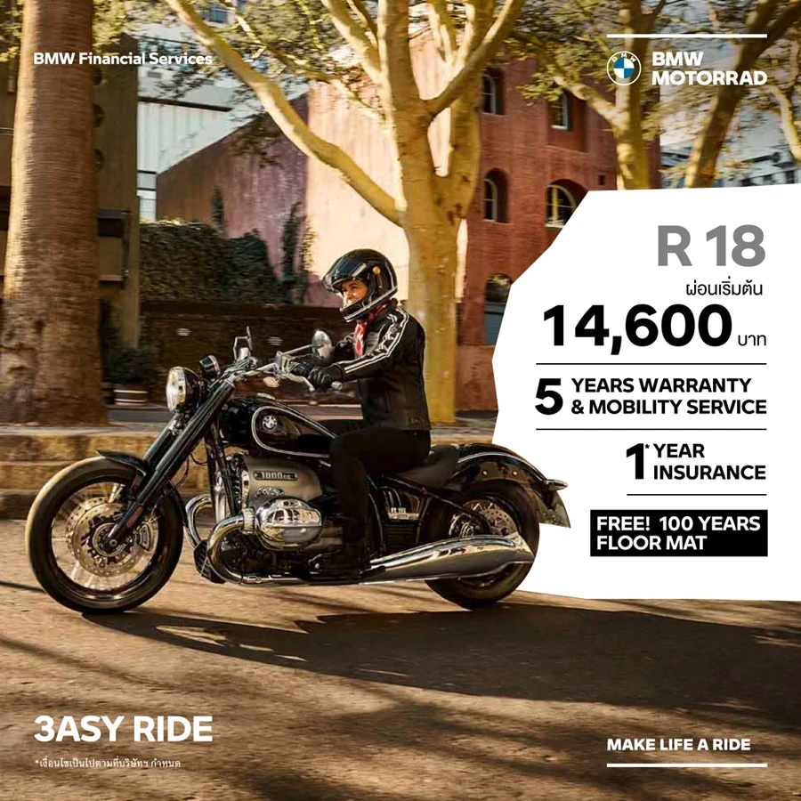 - ข้อเสนอนี้พิเศษสำหรับลูกค้าที่จองรถบีเอ็มดับเบิลยู มอเตอร์ราด พร้อมทำสัญญาทางการเงินที่ร่วมรายการกับ บีเอ็มดับเบิลยู ไฟแนนเชียล เซอร์วิส ประเทศไทย ตั้งแต่วันนี้ – 30 กันยายน 2566 และรับรถภายในวันที่ 30 กันยายน 2566 บริษัทฯ ขอสงวนสิทธิ์ในการเปลี่ยนแปลงเงื่อนไข และข้อกำหนดต่างๆ โดยมิต้องแจ้งให้ทราบล่วงหน้า