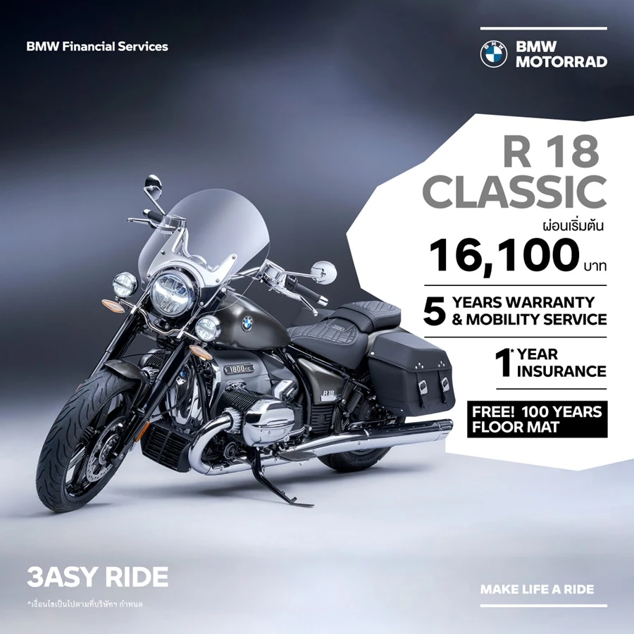 จิตวิญญาณแห่งการเดินทาง ที่สร้างสรรค์ให้มอเตอร์ไซค์คันนี้ พิเศษและไม่เหมือนใคร BMW R 18 Classic เป็นเจ้าของได้แล้ววันนี้ ในราคาเริ่มต้นที่ 1,209,000 บาท ดาวน์เริ่มต้น 241,900 บาท ผ่อนเริ่มต้น 16,100 บาท/เดือน พร้อมข้อเสนอสุดคุ้ม