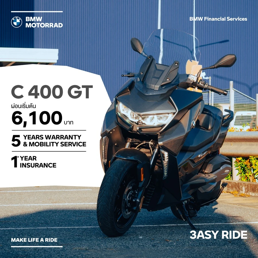 ขับในเมืองมั่นใจ เดินทางไกลก็สบาย กับ BMW C 400 GT ที่เพียบพร้อมด้วยฟังก์ชันมากมายในการขับขี่ เป็นเจ้าของวันนี้ ในราคาเริ่มต้นที่ 435,000 บาท ดาวน์เริ่มต้น 87,000 บาท ผ่อนเริ่มต้น 6,100 บาท/เดือน พร้อมข้อเสนอสุดคุ้ม