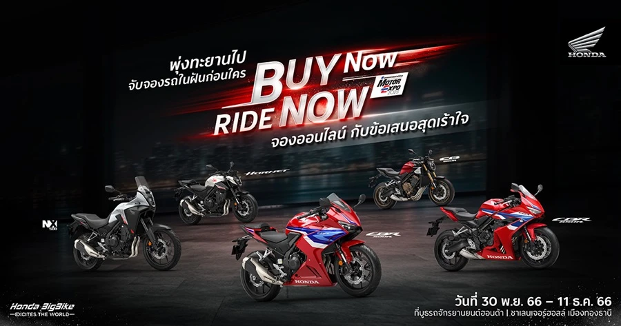 ฮอนด้าบิ๊กไบค์ และ CUB House by Honda เอาใจเหล่าไบค์เกอร์ด้วยข้อเสนอสุดพิเศษส่งท้ายปี จัดโปรโมชัน BUY NOW RIDE NOW ในงาน Motor Expo 2023 เป็นเจ้าของรถจักรยานยนต์ฮอนด้าได้ง่ายๆ ผ่อนเริ่มต้นต่อเดือนเพียง 3,093 บาท (เฉพาะรุ่น) พร้อมรับ Gift Voucher สูงสุดมูลค่ากว่า 100,000 บาท และสิทธิพิเศษอีกมากมายภายในงาน