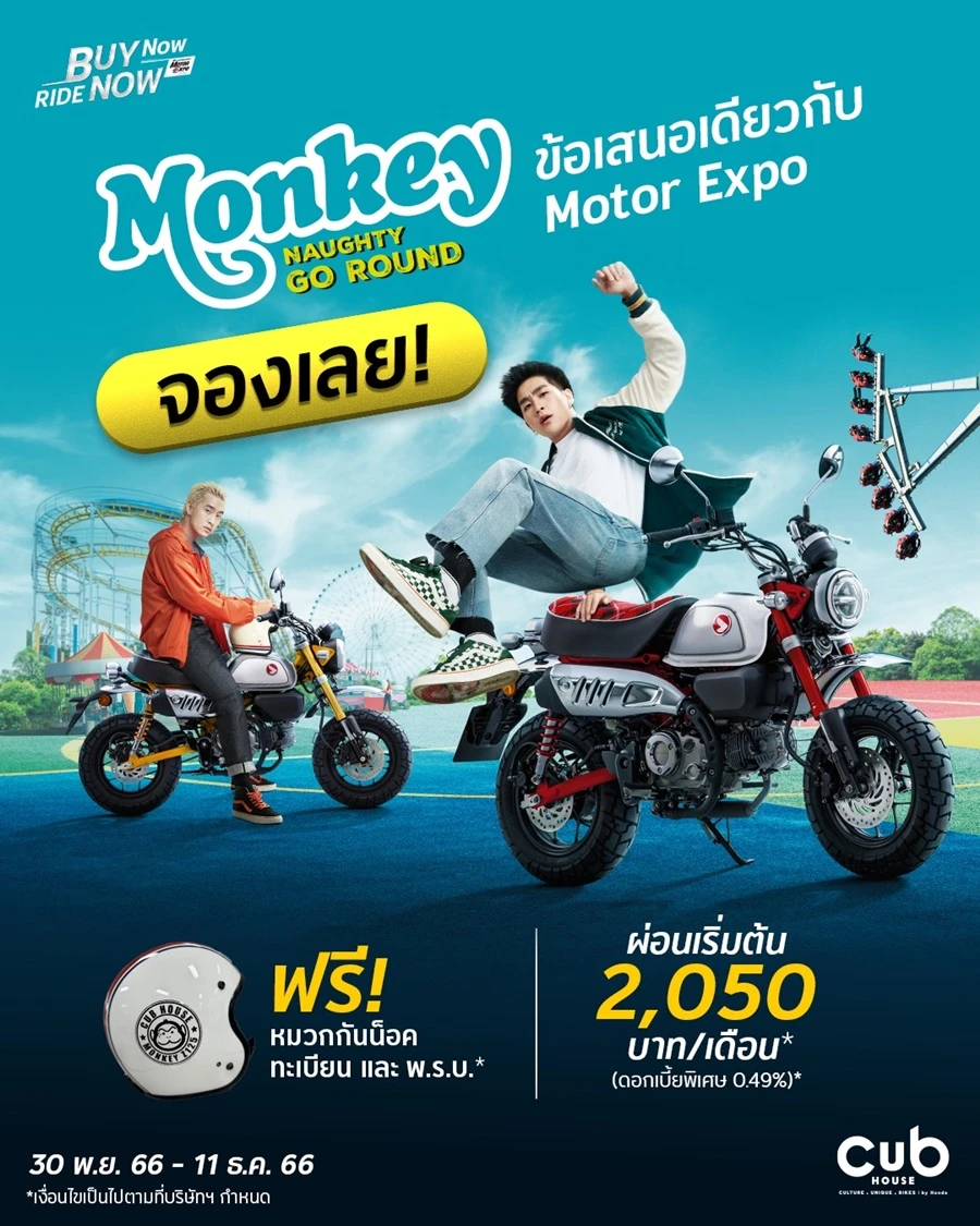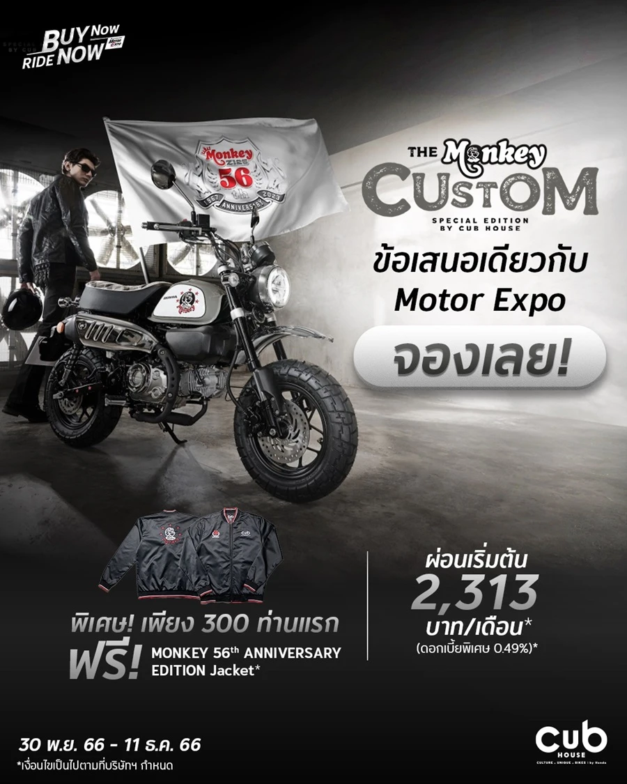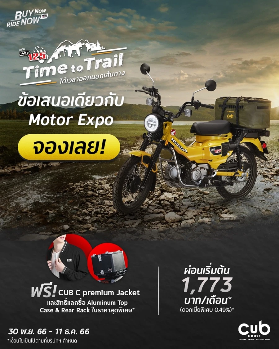 พร้อมกันนี้ Cub House by Honda จัดโปรพิเศษสำหรับ Iconic Models ที่มาพร้อมชุดแต่งพิเศษจากค่ายดังไม่ว่าจะเป็น Kitaco, GCraft, Streamtails มาให้ได้เป็นเจ้าของ กับโปรโมชั่นพิเศษรุ่น Honda Monkey Standard ราคาแนะนำ 99,700 บาท ผ่อนเริ่มต่อเดือนต้น 2,050 บาท ดอกเบี้ยพิเศษ 0.49% จองวันนี้ที่งานรับฟรี หมวกกันน็อค ทะเบียน และ พ.ร.บ. ตามด้วย Honda CT125 New Yellow Color ราคาแนะนำ 88,900 บาท ผ่อนเริ่มต้น 1,773 บาท รับฟรี! CUB C premium Jacket ทะเบียน และ พ.ร.บ. พร้อมสิทธิ์แลกซื้อ Aluminum Top Case & Rear Rack ในราคาสุดพิเศษเพียง 3,900 บาท (จากปกติ 8,900 บาท)