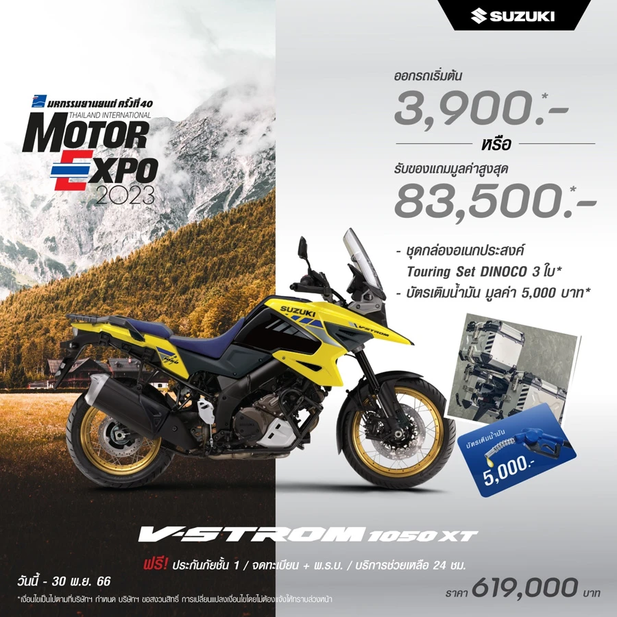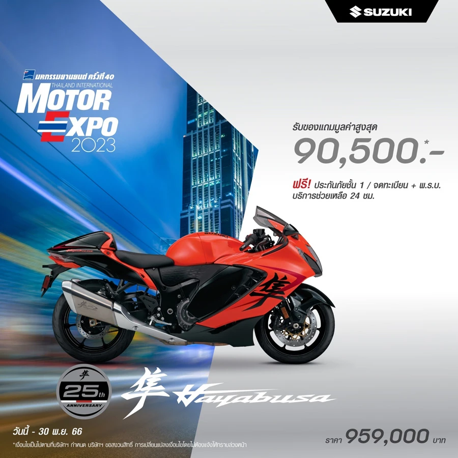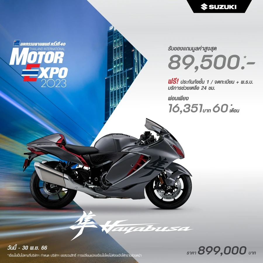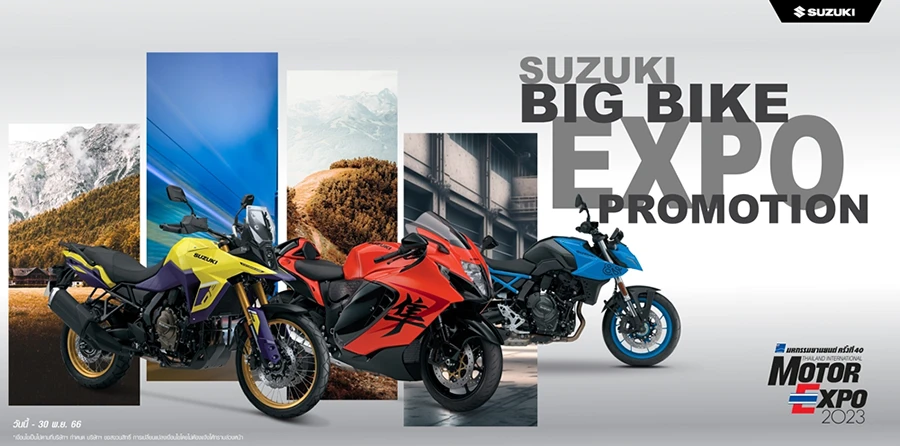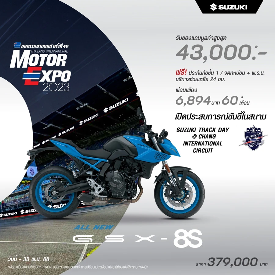 Suzuki มอบความคุ้มค่า ซื้อก่อน ขี่ก่อน ไม่ต้องรอ Motor Expo 2023 พร้อมของแถมจัดเต็มไม่ว่าจะเป็น บัตรเติมน้ำมัน, กล่องอเนกประสงค์ Dinoco 3 ใบ, Suzuki Track Day, ฟรี ประกันภัยรถหาย, ฟรี จดทะเบียน, ฟรี พ.ร.บ., ฟรี บริการช่วยเหลือ รายละเอียดโปรโมชัน ได้แก่