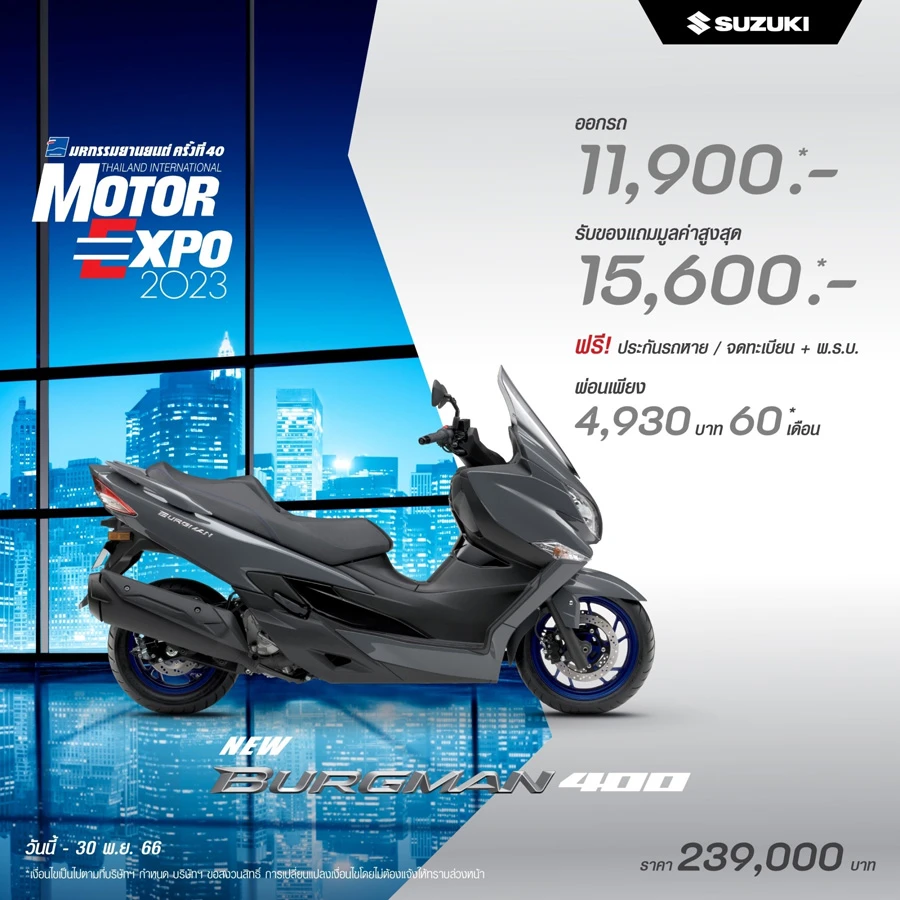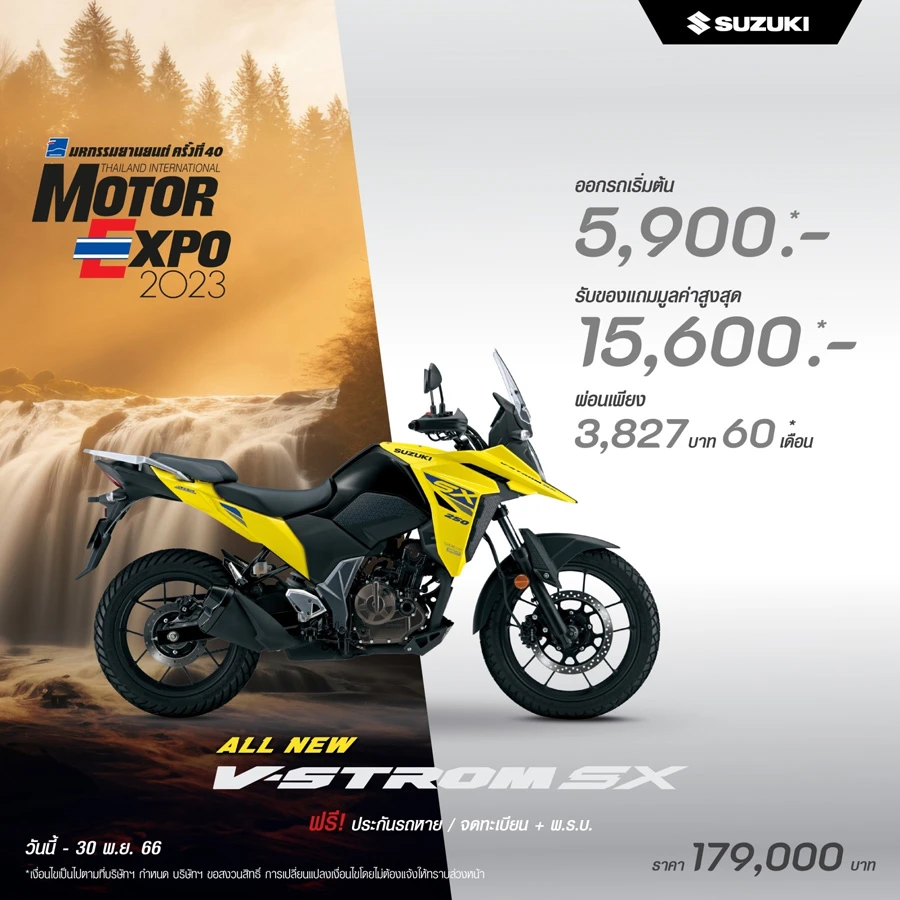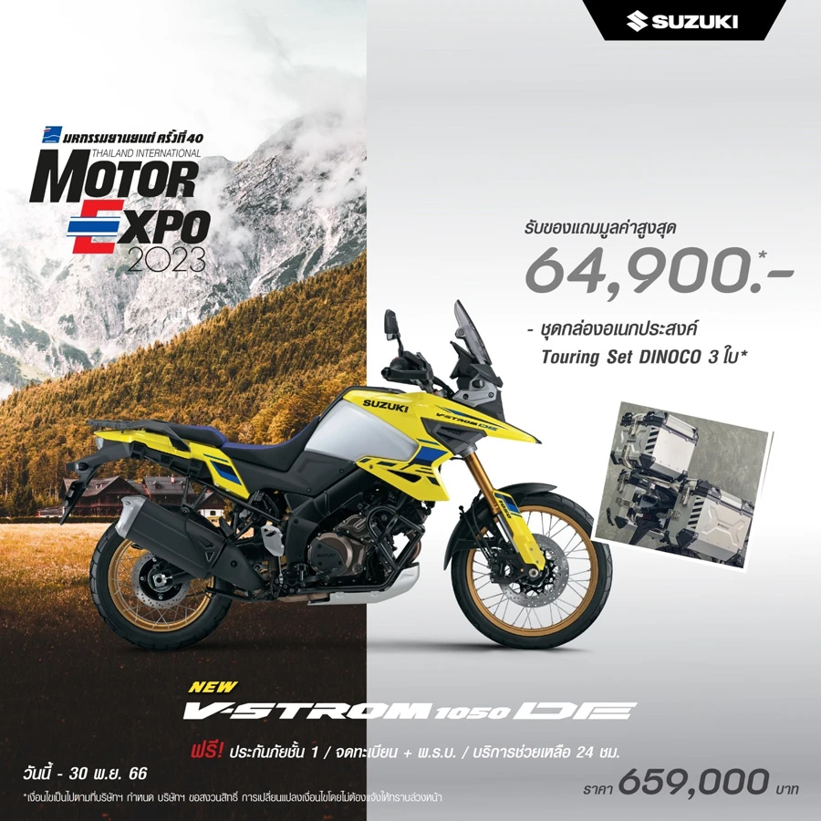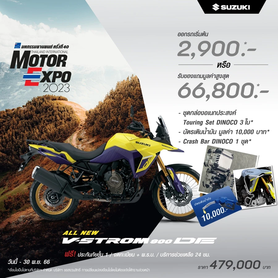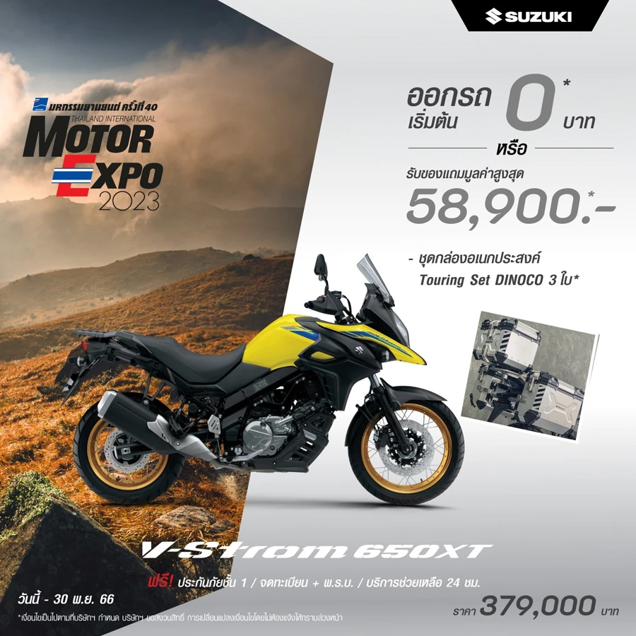 Suzuki มอบความคุ้มค่า ซื้อก่อน ขี่ก่อน ไม่ต้องรอ Motor Expo 2023 พร้อมของแถมจัดเต็มไม่ว่าจะเป็น บัตรเติมน้ำมัน, กล่องอเนกประสงค์ Dinoco 3 ใบ, Suzuki Track Day, ฟรี ประกันภัยรถหาย, ฟรี จดทะเบียน, ฟรี พ.ร.บ., ฟรี บริการช่วยเหลือ รายละเอียดโปรโมชัน ได้แก่