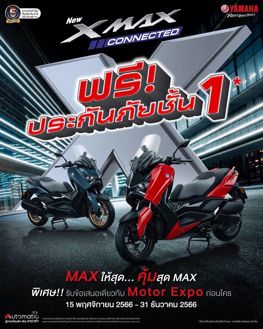 บริษัท ไทยยามาฮ่ามอเตอร์ จำกัด ฉลองครบรอบ 1 ปี XMAX Connected ตัวฮิตคลาส 300 จัดหนักส่งโปรโมชัน MAX ให้สุด...คุ้มสุด MAX เมื่อซื้อรถ YAMAHA XMAX Connected ตั้งแต่ 15 พฤศจิกายน – 31 ธันวาคม 2566 นี้ รับฟรี ประกันภัยชั้น 1 เพิ่มความมั่นใจอุ่นใจยามขับขี่ ข้อเสนอเดียวกับงาน Motor Expo 2023 พร้อมการรับประกัน 5 ปี หรือ 50,000 กม.