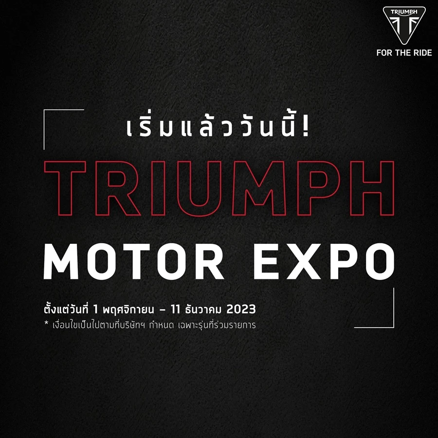 โปรโมชั่น MotorExpo 2023 เริ่มแล้ว Triumph จัดเต็มส่งท้ายปลายปีทุกรุ่น ฉลองฤดูกาลแห่งการขับขี่ กับข้อเสนอทางการเงินสูงสุดถึง 150,000 บาท ในรุ่นที่ร่วมรายการ ตั้งแต่วันที่ 1 พฤศจิกายน – 11 ธันวาคม 2566 พบกับที่ผู้แทนจำหน่ายไทรอัมพ์ 12 แห่งทั่วประเทศ และงานมหกรรมยานยนต์ครั้งที่ 40 (Thailand International Motor Expo 2023) ณ บูธ G13 อิมแพค ชาเลนเจอร์ เมืองทองธานี