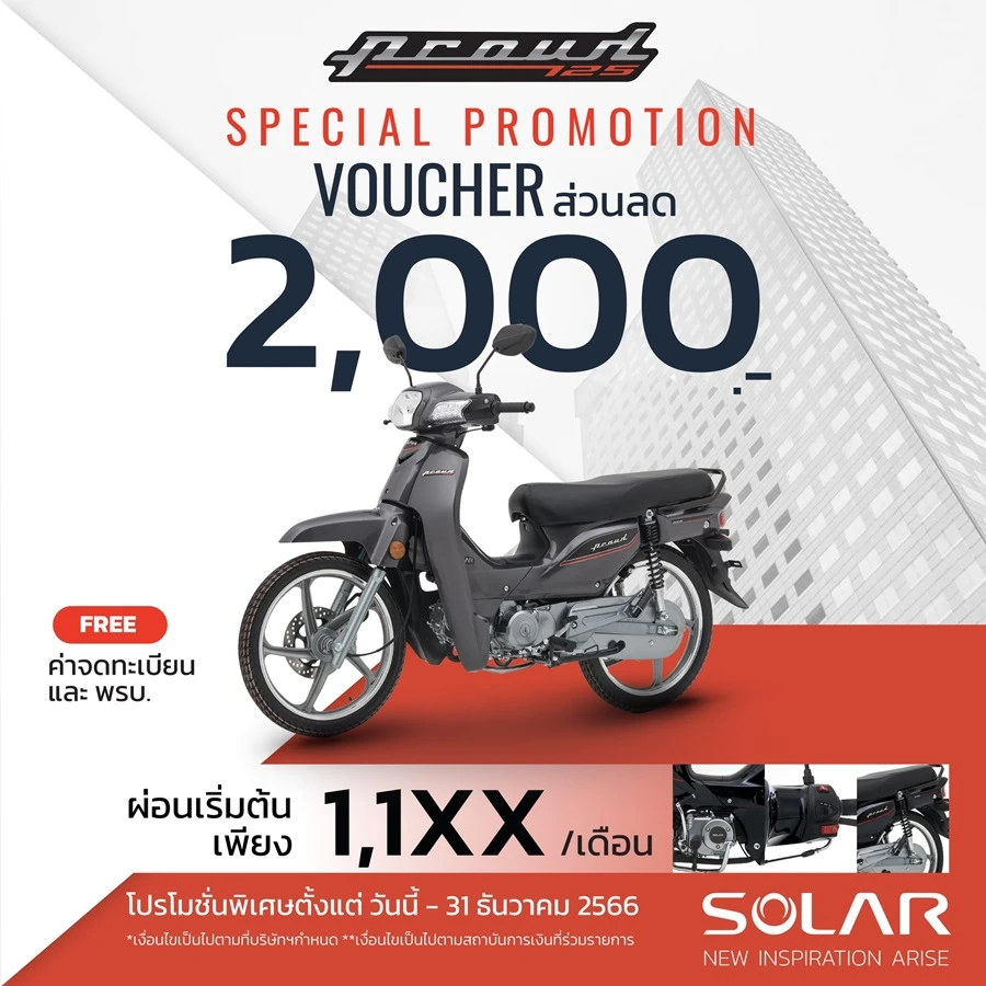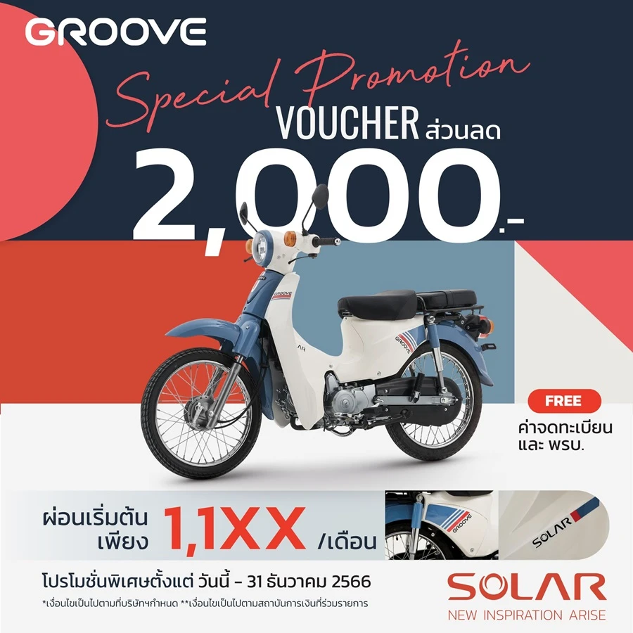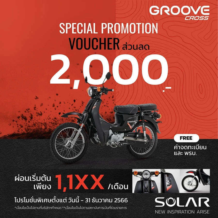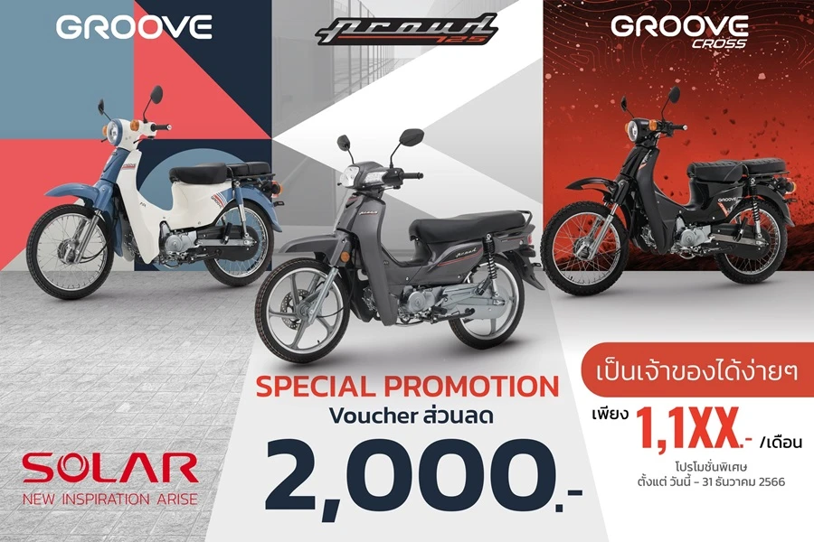 SOLAR มาพร้อมคอนเซ็ปต์ NEW INSPIRATION ARISE กำเนิดใหม่ของแรงบันดาลใจ เสมือนแสงอาทิตย์แรกของทุกวันที่สะท้อนให้เกิดพลังขับเคลื่อนยานยนต์สองล้อสไตล์ใหม่ ที่มีมาให้เลือกถึง 3 สไตล์ด้วยกัน ไม่ว่าจะเป็น PROUD, GROOVE URBAN และ GROOVE CROSS ด้วยคาแรคเตอร์ที่ชัดเจน ดีไซน์โดดเด่น ตอบโจทย์ไลฟ์สไตล์ที่ไม่เหมือนใคร มาร่วมค้นหาแรงบันดาลใจใหม่ด้วยข้อเสนอสุดพิเศษ ทุกรุ่น ทุกสไตล์ รับทันที VOUCHER ส่วนลด 2,000 บาท ฟรี!!! ค่าจดทะเบียน พรบ. และผ่อนเริ่มต้นเพียง 1,1XX บาท/เดือน เท่านั้น ตั้งแต่วันนี้จนถึง 31 ธันวาคม 2566