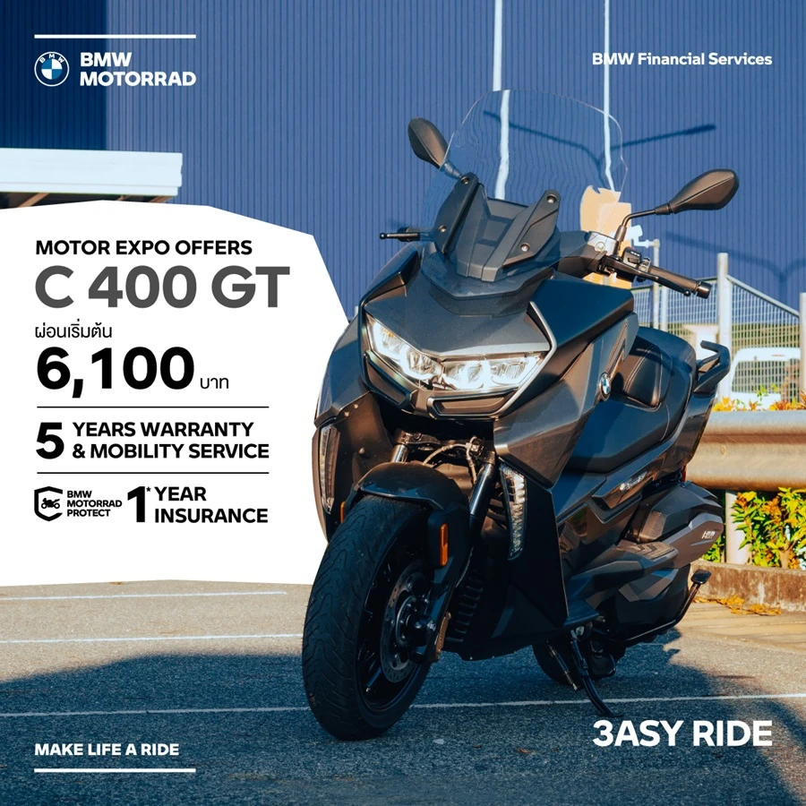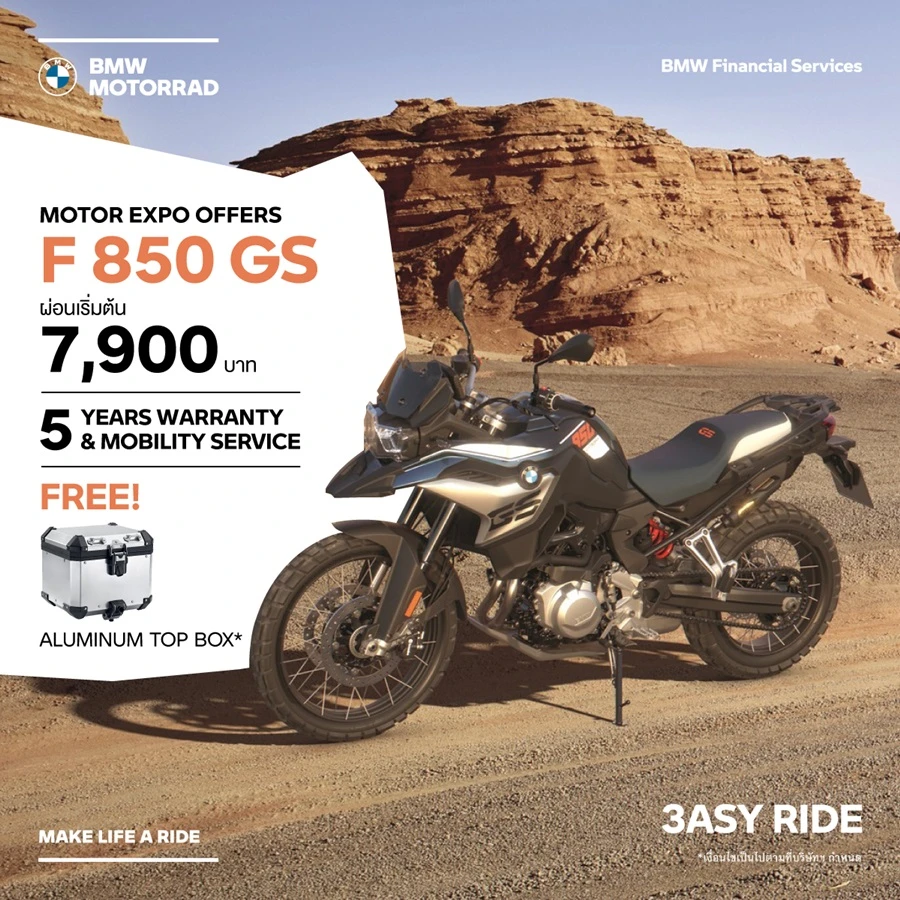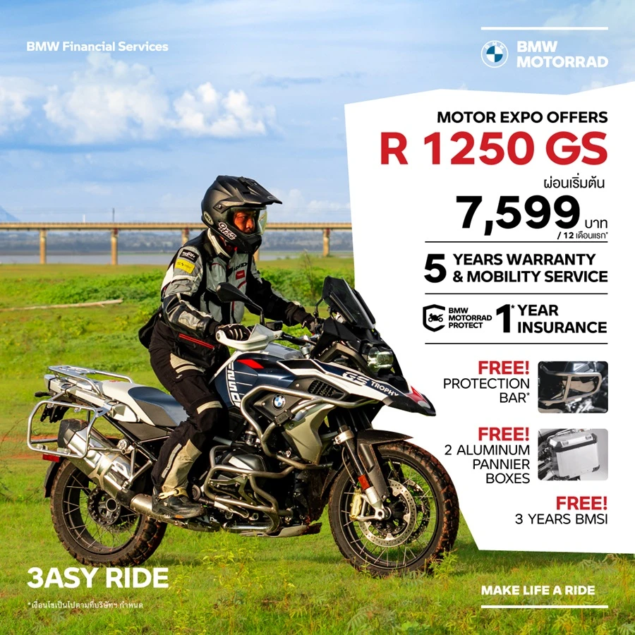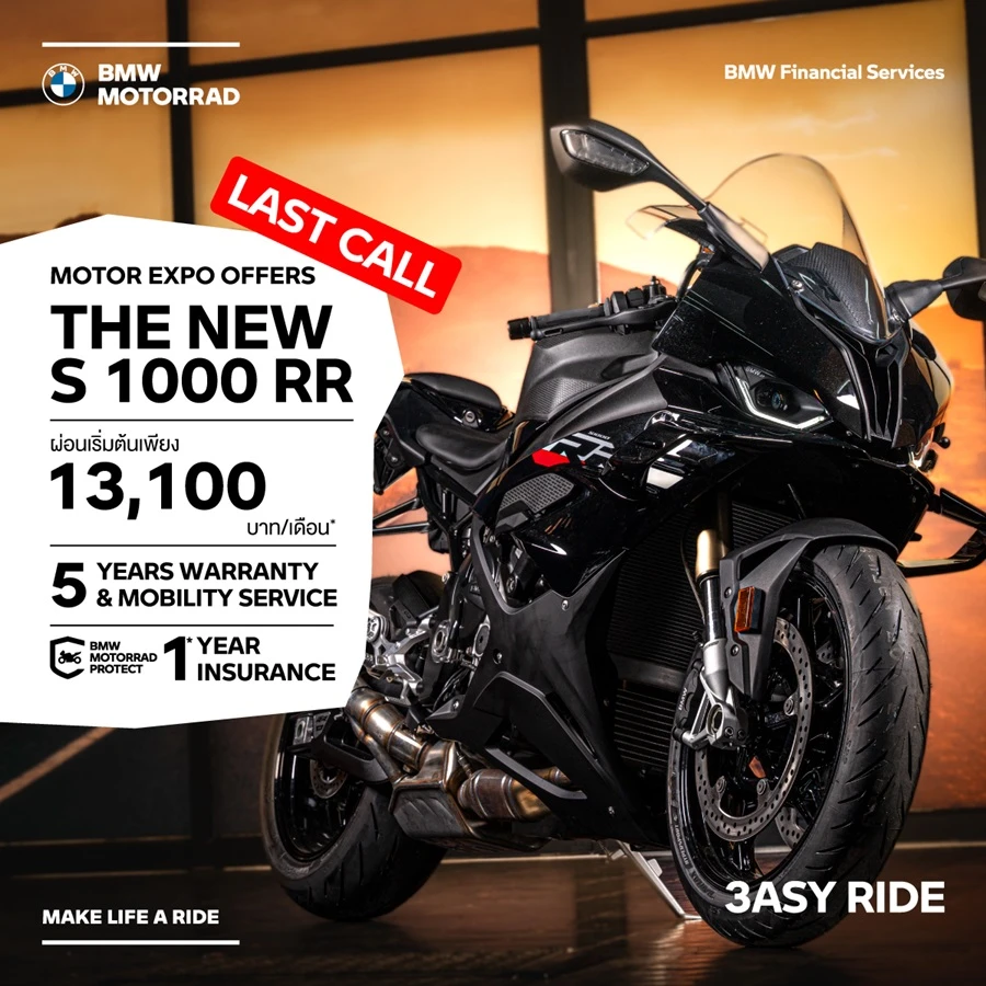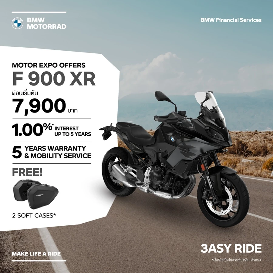- ข้อเสนอนี้พิเศษสำหรับลูกค้าที่จองรถบีเอ็มดับเบิลยู มอเตอร์ราด พร้อมทำสัญญาทางการเงินที่ร่วมรายการกับ บีเอ็มดับเบิลยู ไฟแนนเชียล เซอร์วิส ประเทศไทย ตั้งแต่วันนี้ –30 พฤศจิกายน 2566 และรับรถภายในวันที่ 30 พฤศจิกายน 2566 บริษัทฯ ขอสงวนสิทธิ์ในการเปลี่ยนแปลงเงื่อนไข และข้อกำหนดต่างๆ โดยมิต้องแจ้งให้ทราบล่วงหน้า