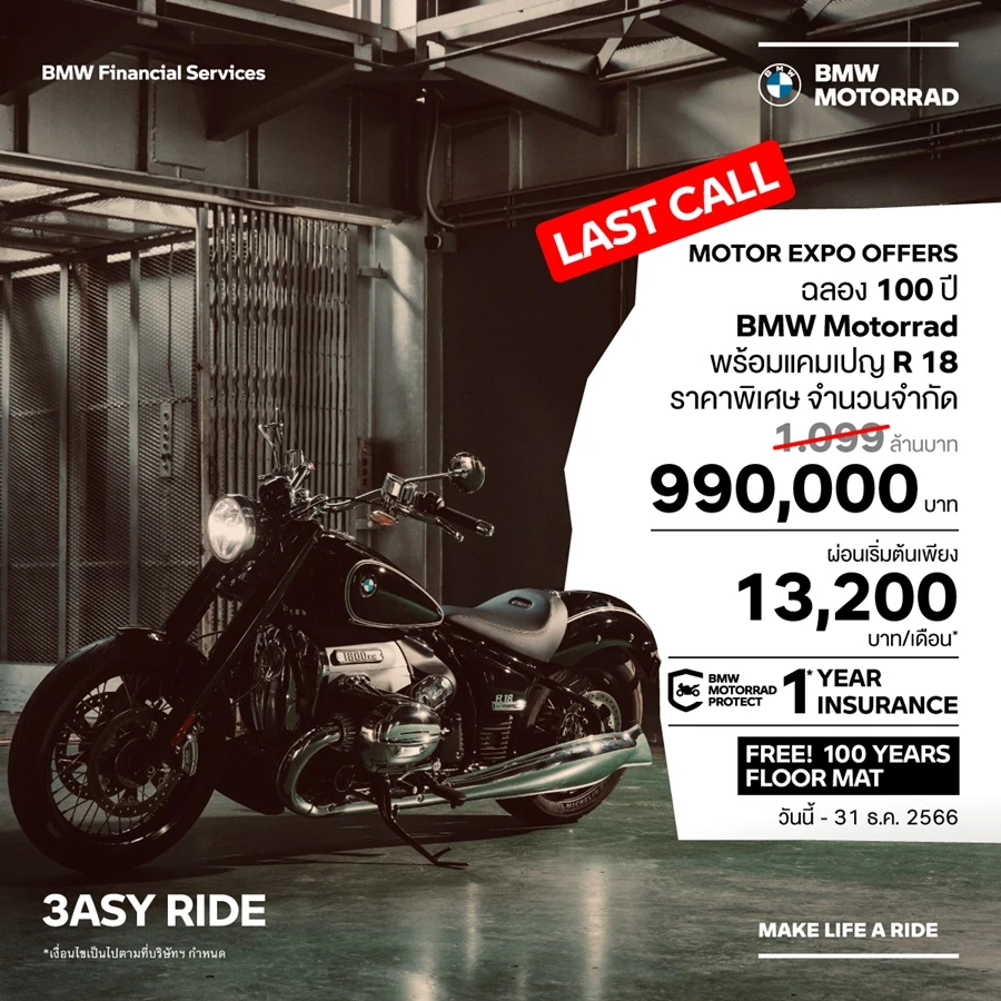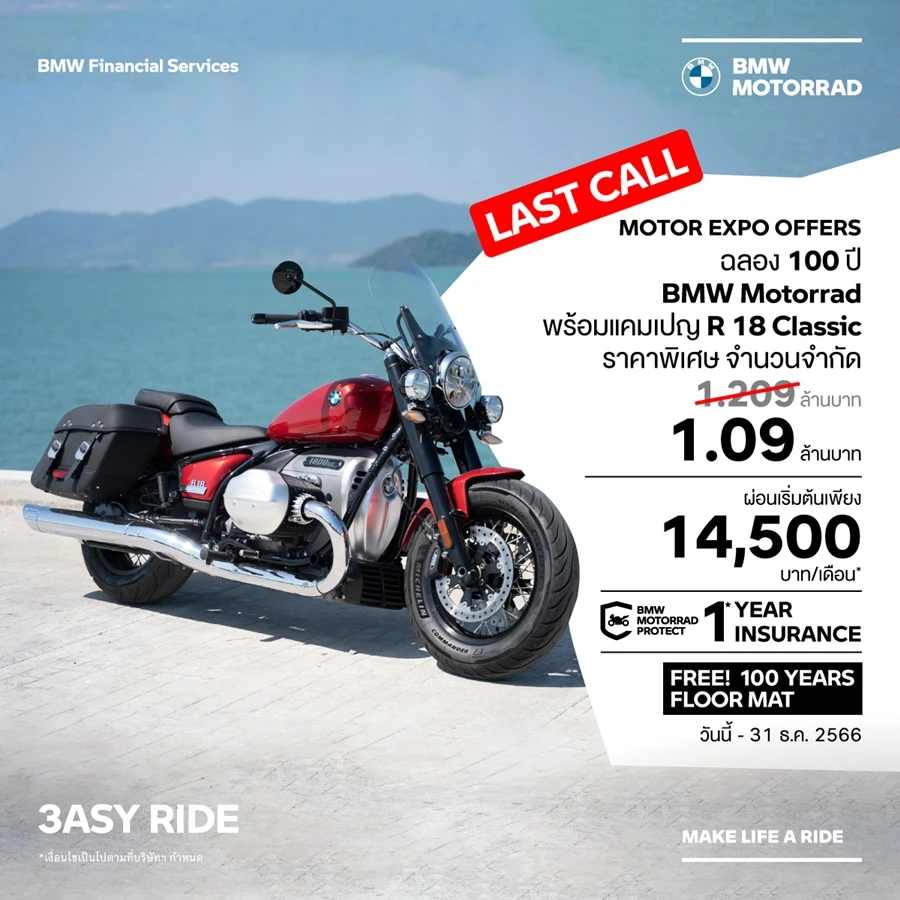 จิตวิญญาณแห่งการเดินทาง ที่สร้างสรรค์ให้มอเตอร์ไซค์คันนี้พิเศษ และไม่เหมือนใคร BMW R 18 Classic ในราคาพิเศษฉลอง 100 ปี BMW Motorrad เพียง 1.09 ล้านบาทเท่านั้น จำนวนจำกัด ดาวน์เริ่มต้นเพียง 218,000 บาท* ผ่อนเริ่มต้นเพียง 14,500 บาท* พร้อมข้อเสนอสุดคุ้ม