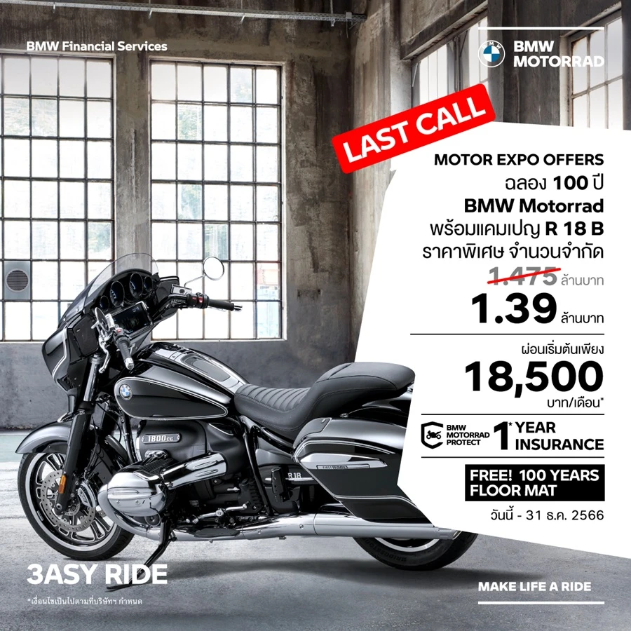 เอกลักษณ์เฉพาะตัวที่ผสมผสานระหว่างศิลปะและความสะดวกสบาย ทำให้ BMW R 18 B เป็นรถที่เหมาะจะเป็นเพื่อนคู่ใจในการเดินทาง เป็นเจ้าของได้แล้ววันนี้ ในราคาพิเศษฉลอง 100 ปี BMW Motorrad เพียง 1.39 ล้านบาทเท่านั้น จำนวนจำกัด ดาวน์เริ่มต้นเพียง 278,000 บาท* ผ่อนเริ่มต้นเพียง 18,500 บาท* พร้อมข้อเสนอสุดคุ้ม