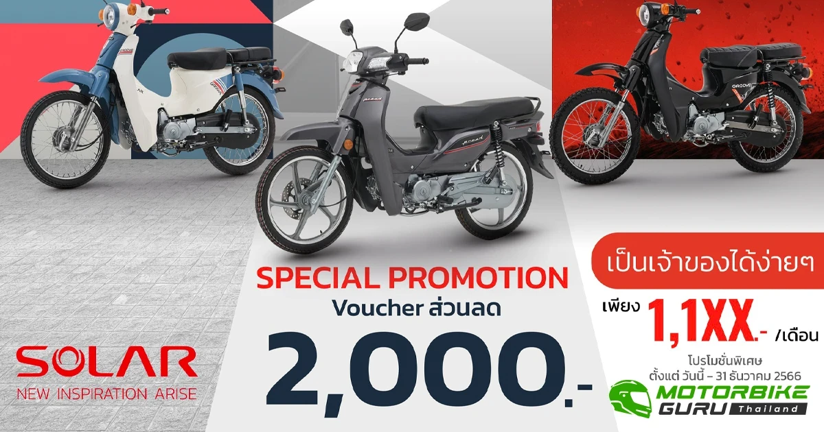 SOLAR มาพร้อมคอนเซ็ปต์ NEW INSPIRATION ARISE กำเนิดใหม่ของแรงบันดาลใจ เสมือนแสงอาทิตย์แรกของทุกวันที่สะท้อนให้เกิดพลังขับเคลื่อนยานยนต์สองล้อสไตล์ใหม่ ที่มีมาให้เลือกถึง 3 สไตล์ด้วยกัน ไม่ว่าจะเป็น PROUD, GROOVE URBAN และ GROOVE CROSS ด้วยคาแรคเตอร์ที่ชัดเจน ดีไซน์โดดเด่น ตอบโจทย์ไลฟ์สไตล์ที่ไม่เหมือนใคร มาร่วมค้นหาแรงบันดาลใจใหม่ด้วยข้อเสนอสุดพิเศษ ทุกรุ่น ทุกสไตล์ รับทันที VOUCHER ส่วนลด 2,000 บาท ฟรี!!! ค่าจดทะเบียน พรบ. และผ่อนเริ่มต้นเพียง 1,1XX บาท/เดือน เท่านั้น ตั้งแต่วันนี้จนถึง 31 ธันวาคม 2566