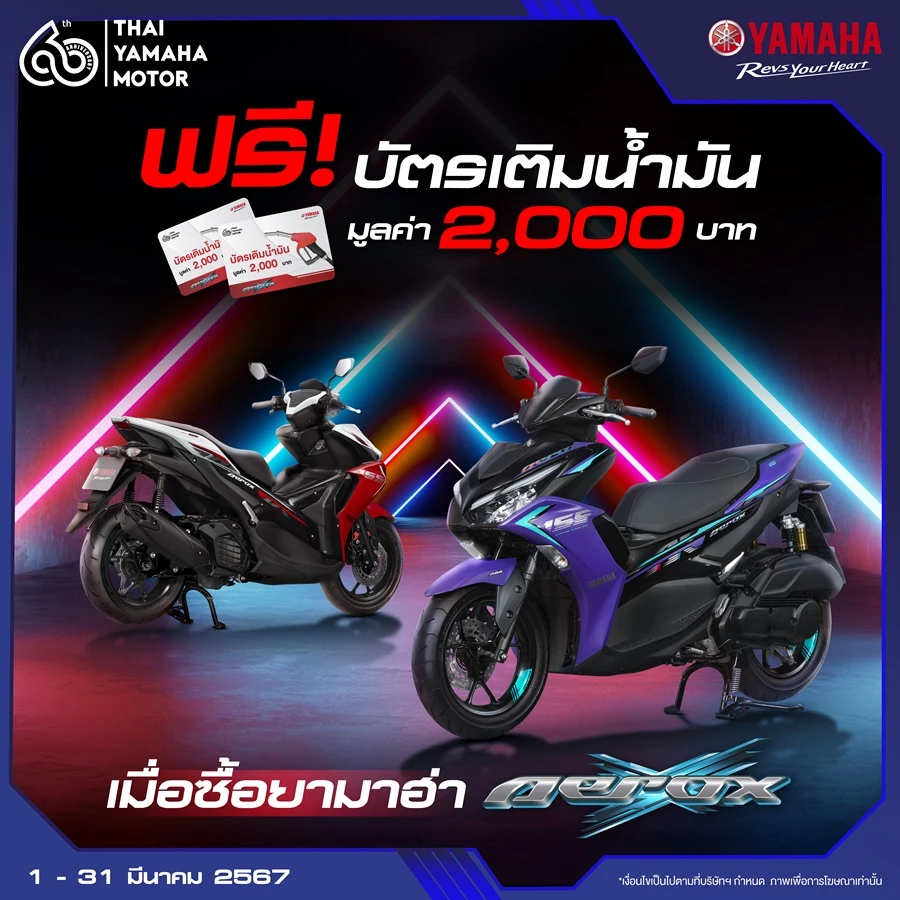 บริษัท ไทยยามาฮ่ามอเตอร์ จำกัด ผู้นำระบบรถจักรยานยนต์ออโตเมติกของประเทศไทย จัดโปรโมชันสำหรับสปอร์ตออโตเมติกรุ่นฮิต เมื่อซื้อรถจักรยานยนต์ ยามาฮ่า แอร็อกซ์ (YAMAHA AEROX) ระหว่างวันที่ 1 มีนาคม – 31 มีนาคม 2567 รับฟรีบัตรเติมน้ำมัน มูลค่า 2,000 บาท ทันที พร้อมเพิ่มความมั่นใจในกับการรับประกันทั้งคัน 5 ปี หรือ 50,000 กิโลเมตร