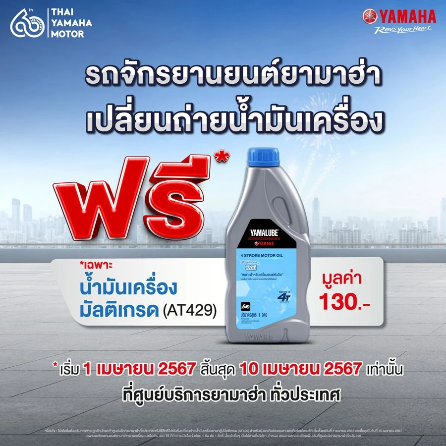 ด้วยบริการสุดพิเศษ เปลี่ยนถ่ายน้ำมันเครื่อง Yamalube มัลติเกรด (AT429) ฟรี! เมื่อนำรถเข้ารับบริการที่ศูนย์ยามาฮ่าทั่วประเทศ จำกัด 1 คัน ต่อ 1 สิทธิ์ ระหว่างวันที่ 1 – 10 เมษายน 2567 นี้