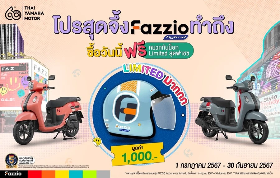 บริษัท ไทยยามาฮ่ามอเตอร์ จำกัด จัดโปรสุดจึ้ง..สำหรับชาวออโตเมติก เมื่อซื้อ YAMAHA FAZZIO ทุกรุ่น รับฟรี หมวกกันน็อก FAZZIO Limited Editon สุด Fazz มูลค่า 1,000 บาท ไปเพิ่มความเก๋กับ YAMAHA FAZZIO คู่ใจ โปรโมชันนี้เริ่มตั้งแต่วันที่ 1 กรกฎาคม ถึง 30 กันยายน 2567 นี้พร้อมรับความมั่นใจ อุ่นใจ คุ้มค่า ของยามาฮ่ากับการรับประกัน 5 ปี หรือ 50,000 กิโลเมตรเป็นเจ้าแรก
