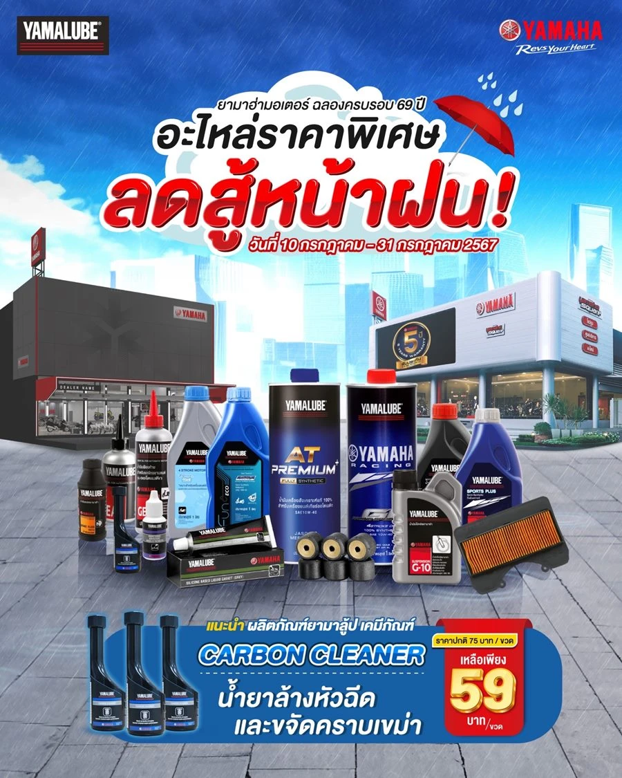 บริษัท ไทยยามาฮ่ามอเตอร์ จำกัด ร่วมฉลอง 69 ปี ยามาฮ่ามอเตอร์ จัดแคมเปญสุดพิเศษต้อนรับฤดูฝนกับอะไหล่แท้จากยามาฮ่า อะไหล่วายเท็ค และผลิตภัณฑ์ยามาลู้ป และอะไหล่สำหรับบำรุงรักษาตามระยะทาง มีให้เลือกมากกว่า 200 รายการ สำหรับรถจักรยานยนต์ทุกรุ่น โดยแบ่งเป็นกลุ่มอะไหล่ดังนี้ กลุ่มชุดตุ้มแรงเหวี่ยง กลุ่มแบตเตอรี่ กลุ่มไส้กรองอากาศ กลุ่มน้ำมันเครื่อง และไส้กรองน้ำมันเครื่อง กลุ่มชุดผ้าเบรก และระบบเบรก กลุ่มยางแท้ (Genuine) กลุ่มผลิตภัณฑ์ Y-TEQ กลุ่มเคมีภัณฑ์ YAMALUBE และกลุ่มชุดไฟ และหัวเทียน