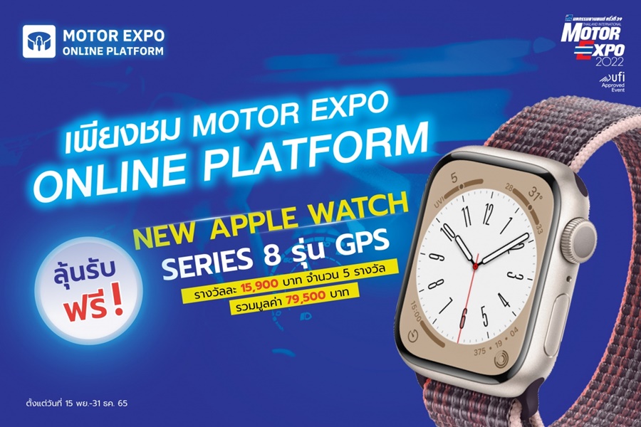 ชม MOTOR EXPO ONLINE PLATFORM ชิงรางวัล ผู้ชมงาน MOTOR EXPO ONLINE PLATFORM ผ่านลิงค์จาก https://op.motorexpo.co.th ตั้งแต่วันที่ 15 พฤศจิกายน 2565 – 31 ธันวาคม 2565 มีสิทธิ์ลงทะเบียนเพื่อชิงรางวัล NEW APPLE WATCH SERIES 8 รุ่น GPS (ตัวเรือน 41 มม.) รางวัลละ 15,900 บาท จำนวน 5 รางวัล รวมมูลค่า 79,500 บาท