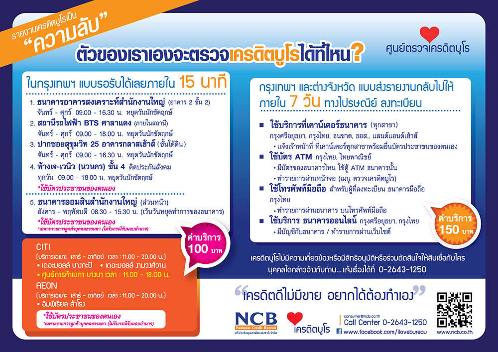 สุดท้ายนี้ ขอให้พวกเรา CheckRaka.com ทุกคนโชคดีเฮงๆ ในการขอสินเชื่อ หรือสมัครบัตรเครดิตนะคะ หากเราเข้าใจระบบการทำงานของเครดิตบูโรนี้แล้ว เราคงเข้าใจมากขึ้นว่าเครดิตบูโรไม่ได้เป็นคนปฏิเสธสินเชื่อเรา ธนาคาร หรือสถาบันการเงินต่างหากที่จะเป็นคนปฏิเสธเราโดยอาศัยข้อมูลของเครดิตบูโรมาประกอบการพิจารณา หากใครมีคำถามเพิ่มเติม ลองสอบถาม Call Center ของเครดิตบูโรได้เลยนะคะที่ 02-643-1250 หรือ www.ncb.co.th
