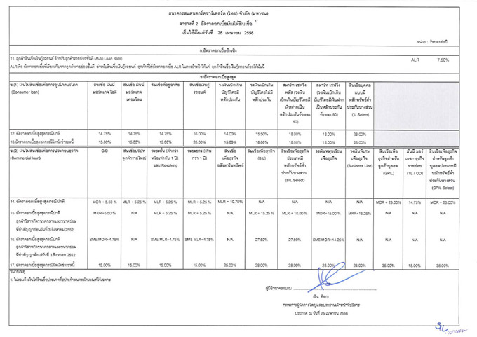 ตัวอย่าง ตารางอัตราดอกเบี้ยเงินให้สินเชื่อ ธนาคารสแตนดาร์ดชาร์เตอร์ด ซึ่งมีความหมายหลากหลายพอสมควร ไม่จำกัดเฉพาะ MLR, MRR, หรือ MOR