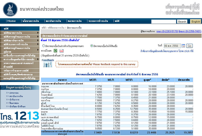 - โดยทั่วๆ ไป MRR จะสูงที่สุดเสมอตามมาด้วย MOR และสุดท้ายคือ MLR จะต่ำที่สุด (ดูตัวอย่างอัตราล่าสุดตามรูปข้างล่าง ณ วันที่ 6 สิงหาคม 2556 จากเว็บไซต์ของแบงค์ชาติ) แต่ก็ไม่ได้หมายความว่าการที่เราได้ดอกเบี้ยในอัตรา MLR จากธนาคารแล้วเราจะดีใจว่าเราได้อัตราที่ต่ำสุด เพราะบางทีถ้าอีกธนาคารเสนออัตราดอกเบี้ย MRR แต่มีลบด้วย X% ซึ่งพอคำนวณออกมาแล้ว จำนวนดอกเบี้ยอาจต่ำกว่า MLR (แบบไม่มีลบอะไรเลย) ก็ได้