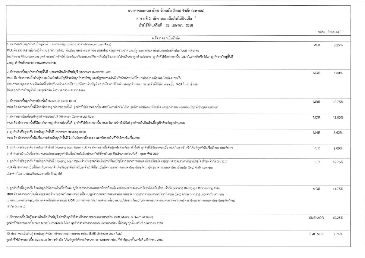 ตัวอย่าง ตารางอัตราดอกเบี้ยเงินให้สินเชื่อ ธนาคารสแตนดาร์ดชาร์เตอร์ด ซึ่งมีความหมายหลากหลายพอสมควร ไม่จำกัดเฉพาะ MLR, MRR, หรือ MOR