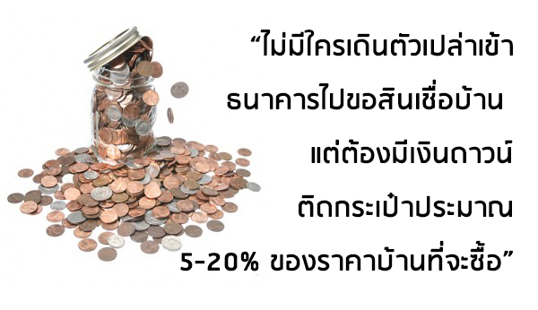 ส่วนใหญ่แล้วจะไม่มีใครเดินตัวเปล่าเข้าธนาคารไปขอสินเชื่อบ้าน แต่ต้องมีเงินดาวน์ติดกระเป๋าประมาณ 5-20% ของราคาบ้านที่จะซื้อ ซึ่งบ้านและคอนโดมิเนียมแต่ละโครงการ อาจมีเงื่อนไขจำนวนเงินดาวน์ไม่เท่ากัน ต้องตรวจสอบและคำนวณเงินในกระเป๋าให้ดี ส่วนใครที่อยากเป็นเจ้าของที่ดินเปล่า ธนาคารมักจะไม่อนุมัติวงเงินสินเชื่อ และสำหรับบ้านมือสอง ก็อาจต้องวางเงินดาวน์ประมาณ 20% ของราคาบ้าน