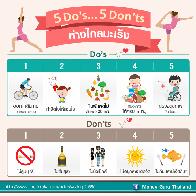 นอกจากการป้องกันตัวเองด้วย Do's และ Don'ts แล้ว จะดีกว่ามั้ย...ถ้าเรามีหลักประกันในรูปแบบของประกันภัยโรคมะเร็งมาช่วยเราดูแลอีกทางหนึ่ง เพราะถ้าหากเราสงสัยหรือเข้าข่ายที่จะเป็นมะเร็ง เราก็ต้องรีบไปหาคุณหมอเพื่อรับการรักษาให้ทันท่วงทีนะคะ ส่วนคนที่ยังไม่เป็นและยังไม่ใกล้ภัยร้ายนี้ เราควรจะป้องกันไว้ก่อน อย่าให้เป็น "วัวหาย แล้วล้อมคอก" ในภายหลัง
