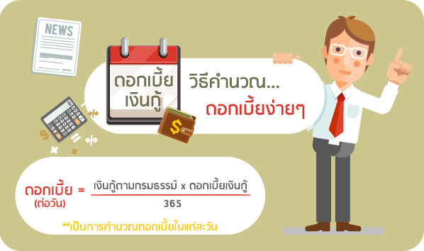 | ดอกเบี้ย = 50,000 x 7% / 365 = 9.59 บาทต่อวัน |