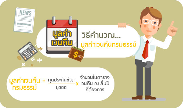 | มูลค่าเวนคืนกรมธรรม์จะมีมูลค่า = (1,000,000/1,000) x 131 บาท = 131,000 บาท |