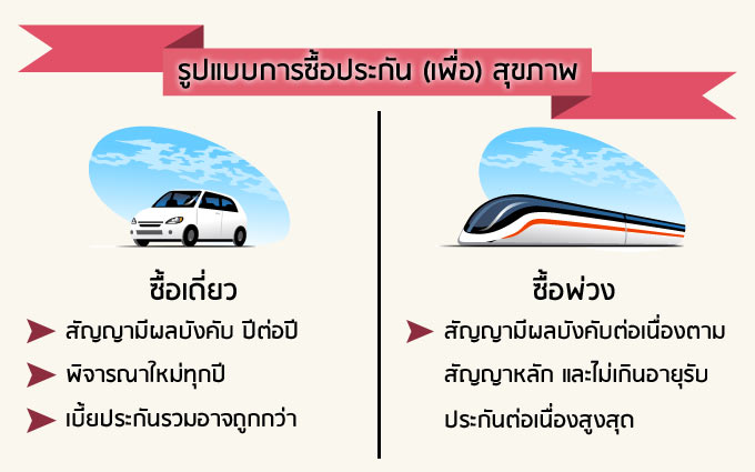 ประกันสุขภาพที่มีอยู่ในปัจจุบัน เราสามารถเลือกซื้อตามรูปแบบที่มีขายกันโดยเลือกได้ทั้งแบบ "ซื้อเดี่ยว" และ "ซื้อพ่วง" ซึ่งข้อจำกัดของทั้ง 2 รูปแบบ มีดังนี้