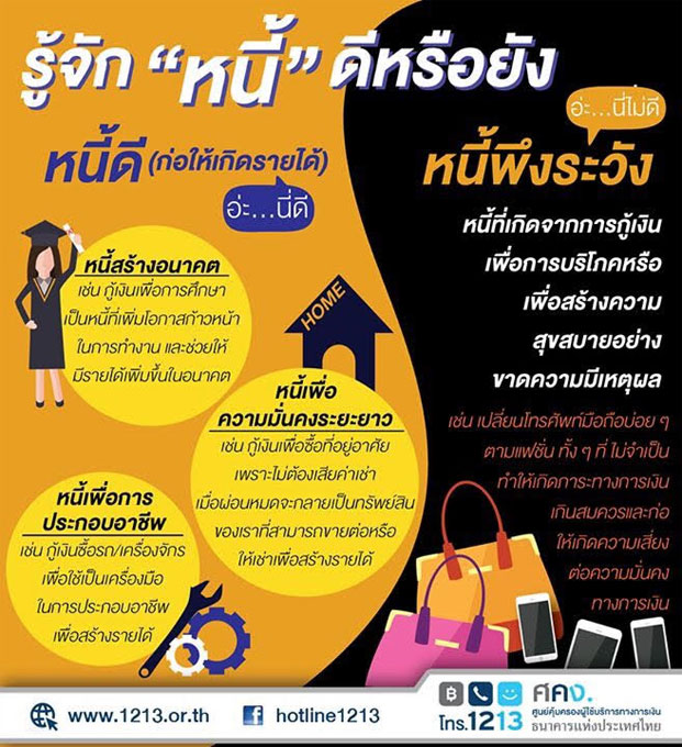 - หนี้สร้างอนาคต เช่น กู้เงินเพื่อการศึกษา เป็นหนี้ที่เพิ่มโอกาสก้าวหน้าในการทำงาน และช่วยให้มีรายได้เพิ่มขึ้นในอนาคต