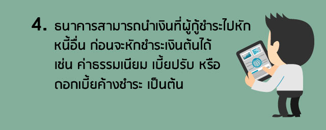 ผู้กู้ตกลงให้ธนาคารนำเงินที่ได้รับชำระจากผู้กู้ ไปหักชำระบรรดาหนี้อุปกรณ์ที่ผู้กู้มีต่อธนาคารตามสัญญาฉบับนี้อันได้แก่ ค่าใช้จ่าย ค่าธรรมเนียม เบี้ยปรับ และดอกเบี้ยที่ค้างชำระก่อน และหากยังมีเงินคงเหลืออยู่ ธนาคารจึงจะนำไปหักชำระต้นเงินกู้ที่ถึงกำหนดชำระในแต่ละงวดจนครบถ้วนทั้งจำนวน